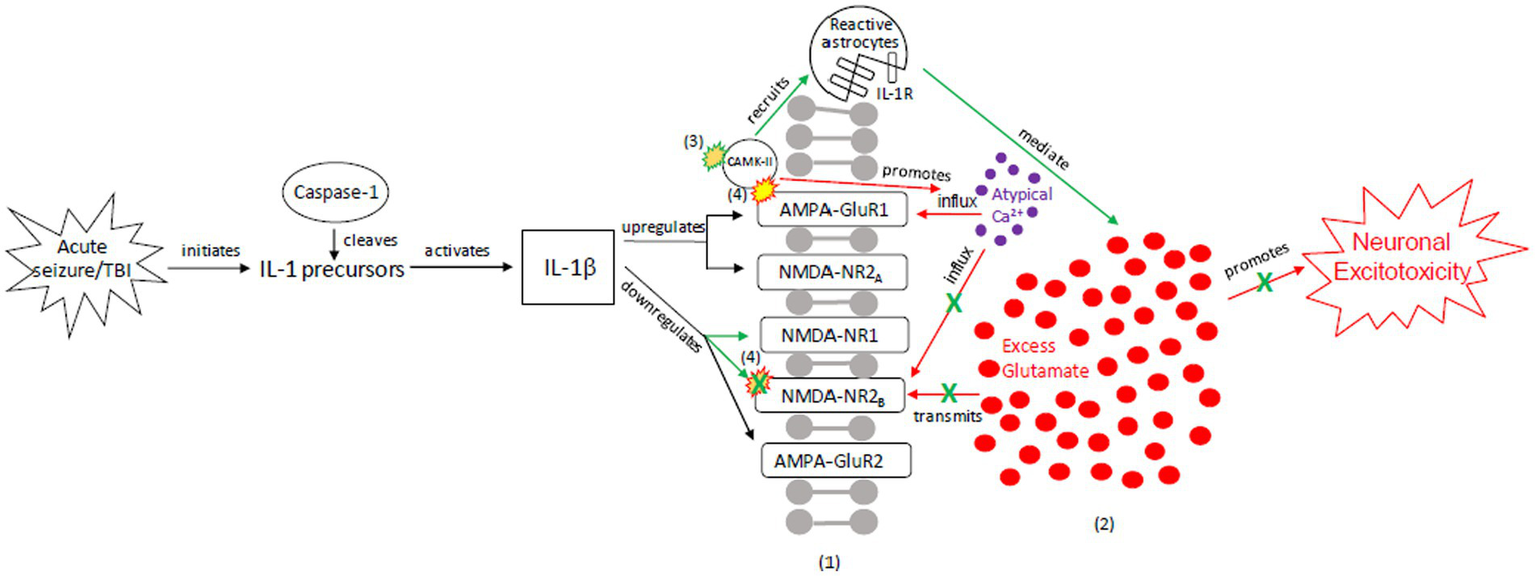 Our proposed acute injury response (AIR) mechanism outlining reactive signaling to an acute, brief seizure or acute, mild TBI. This mechanism shunts cellular signaling away from pro-death response pathways and toward cellular protection, with the goals of restoring the balance between glutamate release and reuptake, intracellular Ca2+-driven ER stress responses, and apoptotic-necrotic dynamics. In response to acute injury, caspase-1 cleaves IL-1 precursors, resulting in IL-1β formation. IL-1β unselectively up-or down-regulates glutamate receptor subunit densities, resulting in an acute disruption of balanced glutamate release and reuptake. There is increased CaMK-II activation that promotes increased glutamate release (102, 103). Unselective CaMK-II phosphorylation and autophosphorylation occurs at upregulated AMPA-GluR1 (104) but not at down-regulated NMDA-R2B (105), resulting in increased AMPA-GluR1 Ca2+ influx/channel conductance and decreased NMDA-NR2B Ca2+ influx/channel conductance, respectively. However, CaMK-II also recruits astrocytes into the affected region (59, 60, 106, 107). Increased astrocytes/IL-1 receptor density aid in clearing excess glutamate and ILs, inhibiting further glutamate release, thereby limiting excitotoxic propagation. (1) = Neuronal membrane, (2) = Synaptic cleft, (3) = CaMK-II autophosphorylation, (4) = CaMK-II-Glutamate receptor phosphorylation. Red = Excitotoxic signaling, Green = Neuroprotective signaling. X = response reduction/down-regulation.