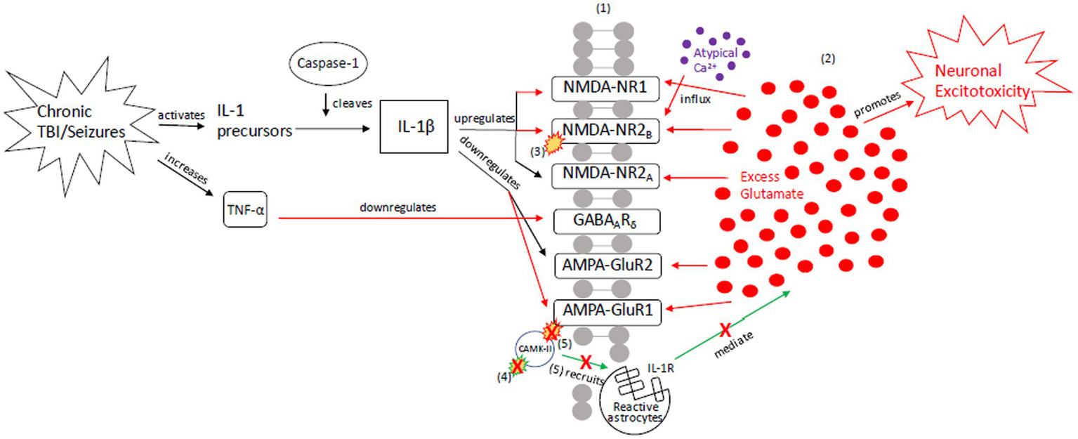 Our proposed recurrent injury response (RIR) mechanism outlining reactive signaling to chronic and/or moderate–severe TBI and chronic and/or prolonged seizures. This mechanism shunts cellular signaling toward pro-death response pathways of apoptosis and necrosis due to imbalanced glutamate release and reuptake, Ca2+-driven ER stress responses, and apoptotic-necrotic dynamics. In response to chronic injury, caspase-1 cleaves IL-1 precursors, resulting in IL-1β formation, and TNF-α downregulates GABAA receptors (18, 108–113). However, unlike the AIR mechanism, IL-1β increases NMDA receptor activity via GluNR2B phosphorylation (112). Increased NMDA receptor densities contribute to atypical Ca2+ influx and prolonged excitotoxic signaling. Concurrently, AMPA-GluR1 and-GluR2 receptors are down-regulated in response to chronic injury, resulting in dysregulated CaMK-II autophosphorylation and AMPA-GluR1 site phosphorylation (21–23, 49, 114–116). Due to disrupted CaMK-II phosphorylation and autophosphorylation, reactive astrocytes cannot be successfully recruited to the synapse to clear excess glutamate and proteasome recruitment into dendritic spines is impaired, respectively (117). The result is neuronal excitotoxic depolarization and propagation, neurotoxic release of ATP, and preferential apoptotic signaling (118). (1) = Neuronal membrane, (2) = Synaptic cleft, (3) = IL-1β-activated NMDA-NR2B phosphorylation, (4) CaMK-II autophosphorylation, (5) CaMK-II-AMPA-GluR1 phosphorylation. Red = Excitotoxic signaling, Green = Neuroprotective signaling. X = response reduction/down-regulation.