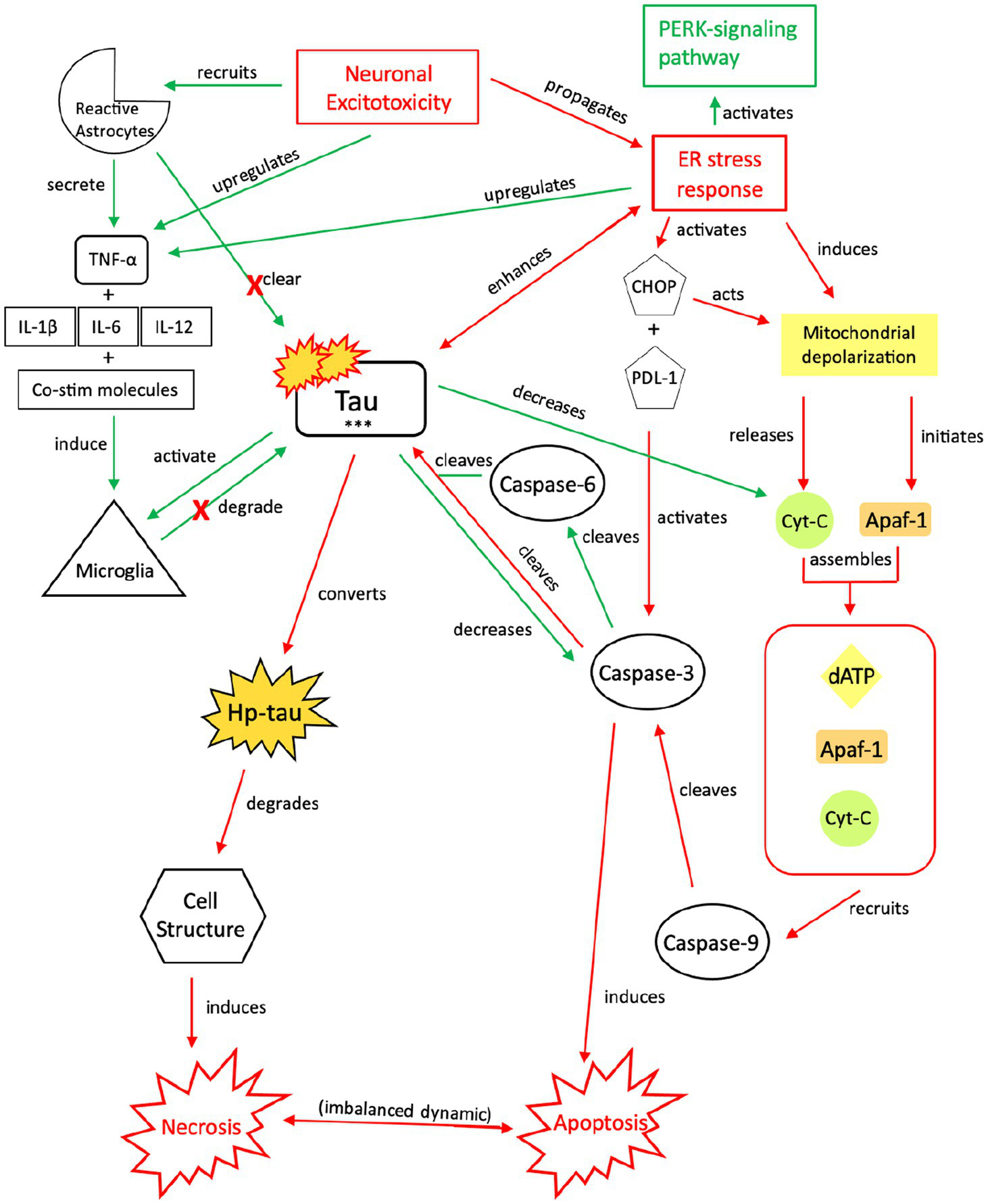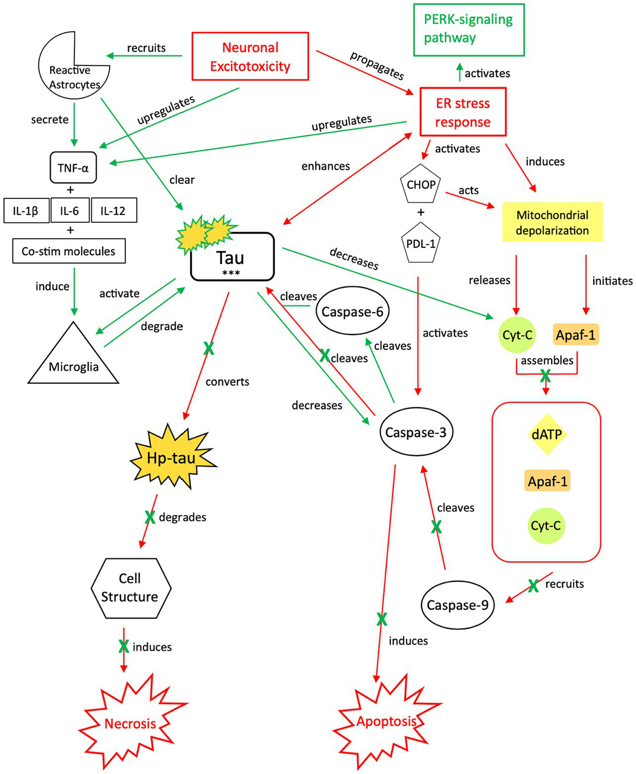 Our proposed neuroprotective response mechanism involving tau (NPT). Neuronal excitotoxicity imbalances the ER stress response, which activates two pathways: the PERK pathway, responsible for reverting the cell to homeostasis and preserving its integrity, and pro-cell death signaling cascades via CHOP and rapid mitochondrial depolarization, such as apoptosis. In typical apoptotic signaling, mitochondrial depolarization initiates Apaf-1 and releases cyt-c. Cyt-c, with Apaf-1 and dATP, assembles into an apoptosome complex (119–121). The apoptosome complex recruits caspase-9, caspase-9 cleaves caspase-3, and caspase-3 activates apoptosis (122, 123). Tau preserves cellular integrity and reverts cellular signaling away from pro-cell death signaling cascades. Although reduction of caspase-3 cleavage of tau reverts the cell away from apoptotic signaling, tau is cleaved by additional caspases such as caspase-6, resulting in tau phosphorylation (124–128). The increased presence of p-tau decreases the concentration of cyt-c and caspase-3, thereby further inhibiting apoptotic signaling (122, 129, 130). To avoid additional cell death pathways (i.e., necrosis), increases in cytokine expression, TNF-α, and tau concentrations recruit reactive astrocytes and microglia to break down excess tau into non-toxic components (131–136). Successful breakdown of accumulated tau by microglia and reactive astrocytes downregulates pro-death signaling pathways and restores cellular homeostasis. PERK, protein kinase R-like ER kinase; TNF, tumor necrosis factor; IL, interleukin; Co-stim, co-stimulatory (molecules); cyt-c, cytochrome-c; Apaf-1, apoptotic peptidase activating factor-1; dATP, deoxyadenosine triphosphate; NFTs, neurofibrillary tangles; Red, Pro-death signaling; Green, Neuroprotective signaling; o-tau, tau oligomers; t-tau, total tau; p-tau, phosphorylated tau; ***, O-tau, t-tau, p-tau; X, response reduction/down-regulation.