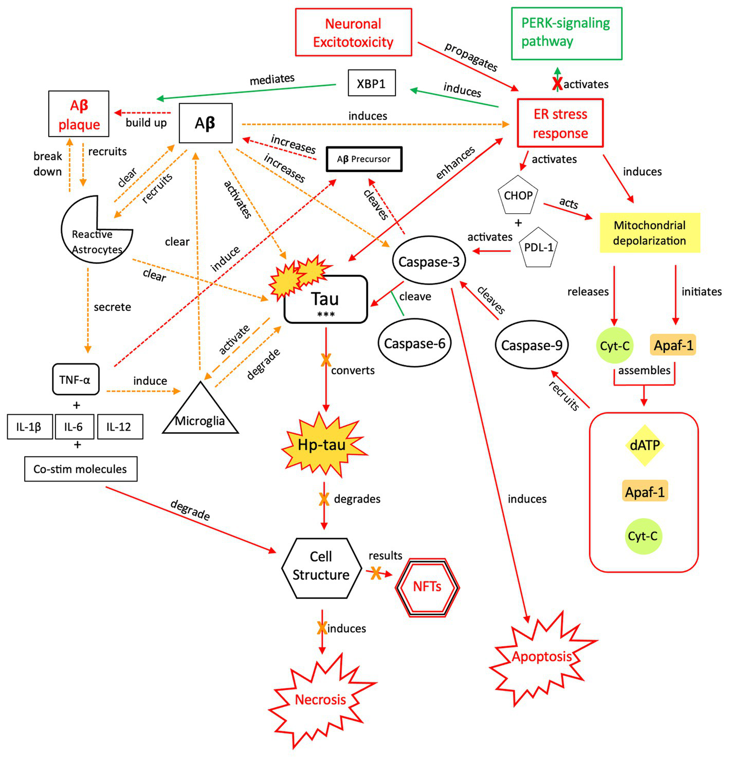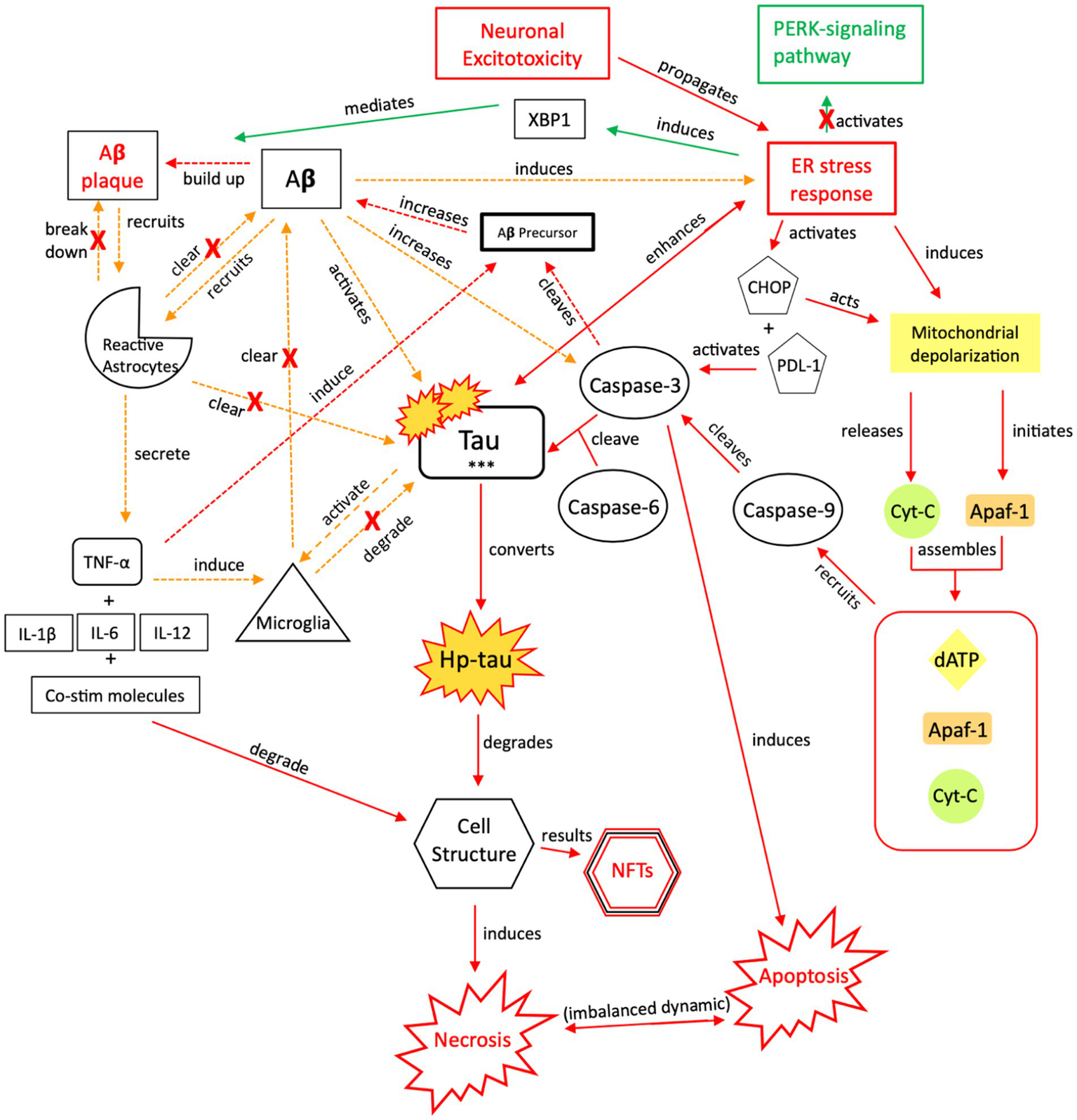 The injurious response of Aβ, aka its failed “last ditch effort” to downregulate propagation of toxic tau and rebalance apoptotic-necrotic signaling dynamics. Due to accumulated toxic tau aggregates and dysregulated tau clearance by reactive astrocytes and microglia, pro-death signaling mechanisms become favored over cellular preservation signaling. However, a recurrent, reactive ER stress response leads to an imbalance of apoptotic-necrotic signaling and enhances atypical tau phosphorylation. Further, Aβ precursor protein is cleaved by caspase-3, and Aβ concentrations increase, further propagating the ER stress response (88, 154, 155). Due to the Aβ precursor overexpression and increased Aβ production, defective mitochondria are produced, mitochondrial dynamics are altered, and their trafficking is reduced, leading to further intracellular Ca2+ influx and apoptotic-necrotic imbalance (166). However, the ER stress response also has neuroprotective effects, inducing selective transcription factor XBP1, which mediates Aβ plaque formation (88). Simultaneously, Aβ directly recruits reactive astrocytes and indirectly recruits microglia, through TNF-α and pro-inflammatory signaling, which cluster around Aβ plaques to clear them (157, 167, 168). Yet, the induction of pro-inflammatory signaling from astrocytic recruitment further induces Aβ precursor protein; increased Aβ concentrations result in increased atypical tau phosphorylation/hyper-phosphorylation and further ER stress response induction (169). Thus, reactive astrocytes have both neuroprotective and injurious effects (170). Continued apoptotic-necrotic signaling imbalance, degradation in cell structure, and NFT formation results from atypical activation of these pathways. PERK, protein kinase R-like ER kinase; Aβ, amyloid beta; XBP1, X-box binding protein 1; TNF, tumor necrosis factor; IL, interleukin; Co-stim, co-stimulatory (molecules); Cyt-c, cytochrome-c; Apaf-1, apoptotic peptidase activating factor-1; dATP, deoxyadenosine triphosphate; NFTs, neurofibrillary tangles; Red = Pro-death signaling, Green = Neuroprotective signaling, Orange = Aβ-involved signaling; o-tau, tau oligomers; t-tau, total tau; p-tau, phosphorylated tau; *** = O-tau, t-tau, p-tau. X = reduction/down-regulation. Solid line = signaling cascade induced/propagated by the ER stress response and tau; dashed line = signaling cascades resulting from Aβ involvement.