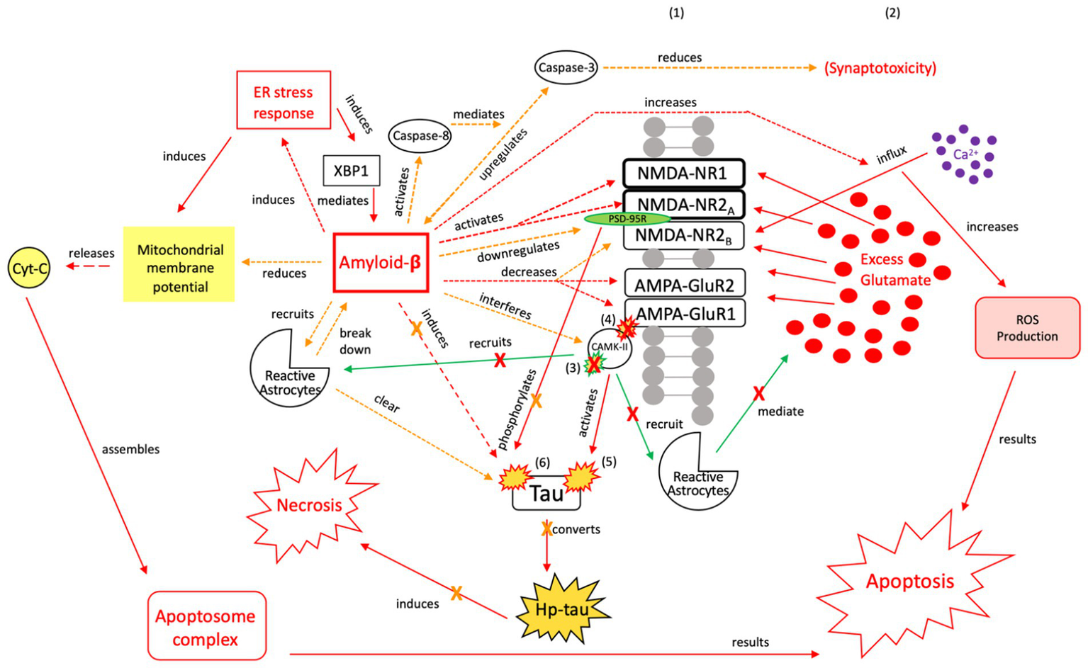 The neuroprotective response of Aβ, aka the “last ditch effort” to revert the cell to pro-apoptotic signaling and reduce tau and Aβ toxicity. Selective NMDA regulation, downregulating scaffolding protein PSD-95, and activating caspase-8 reduce the excitotoxic effects of Aβ and atypical tau phosphorylation (154). PSD-95 receptor downregulation results in reduced tau phosphorylation and protection of synapses from the effects of Aβ, while caspase-8 activation indirectly reduces synaptotoxicity by mediating the relationship between Aβ and caspase-3 (163, 164). Aβ also reduces mitochrondrial membrane potential and directly induces the ER stress response, resulting in apoptosome complex formation and eventual ROS-induced apoptosis (165). Reactive astrocytes are recruited to break down Aβ and clear tau aggregates. However, Aβ also has injurious effects, as it increases intracellular Ca2+ and ROS production, while also acting directly on tau (154). Therefore, this mechanism is considered a “last ditch effort” to acutely kill the cell via apoptotic signaling to minimize the negative effects from toxic tau, Aβ accumulation, and necrotic signaling. We posit that limiting the effects of tau and Aβ toxicity is predicated on the acute nature of this response and treatment of the underlying pathology to avoid irreversible injury and/or a transition to a more widespread neurodegenerative process. XBP1, X-box binding protein 1; Cyt-c, cytochrome-c; ROS, reactive oxygen species; Red = Pro-death signaling, Green = Neuroprotective signaling, Orange = Aβ-involved signaling; X = reduction/down-regulation. Solid line = signaling cascade induced/propagated by the ER stress response and tau; dashed line = signaling cascades resulting from Aβ involvement. (1) = Neuronal membrane, (2) = Synaptic cleft, (3) = CaMK-II-autophosphorylation, (4) = CaMK-II-Glutamate receptor phosphorylation, (5) = CaMK-II-tau-phosphorylation, (6) = PSD95-NMDA receptor complex-tau phosphorylation.