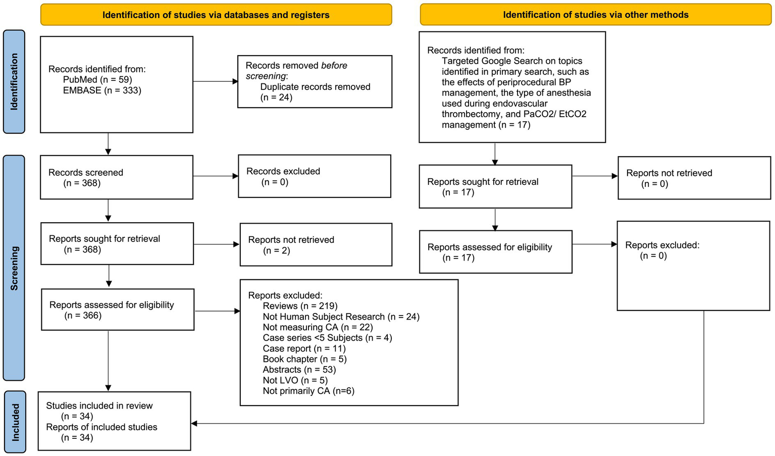 The PubMed and EMBASE search strategy yielded 368 studies after duplicates were removed. Of these, 366 articles were accessible and assessed for eligibility, while two could not be retrieved. Among the accessible articles, 17 met the inclusion and exclusion criteria. In addition, the targeted Google search added 17 more qualifying articles, resulting in a total of 34 articles for our review (Figure 2). We reported the results in a discussion format under different relevant subheadings.