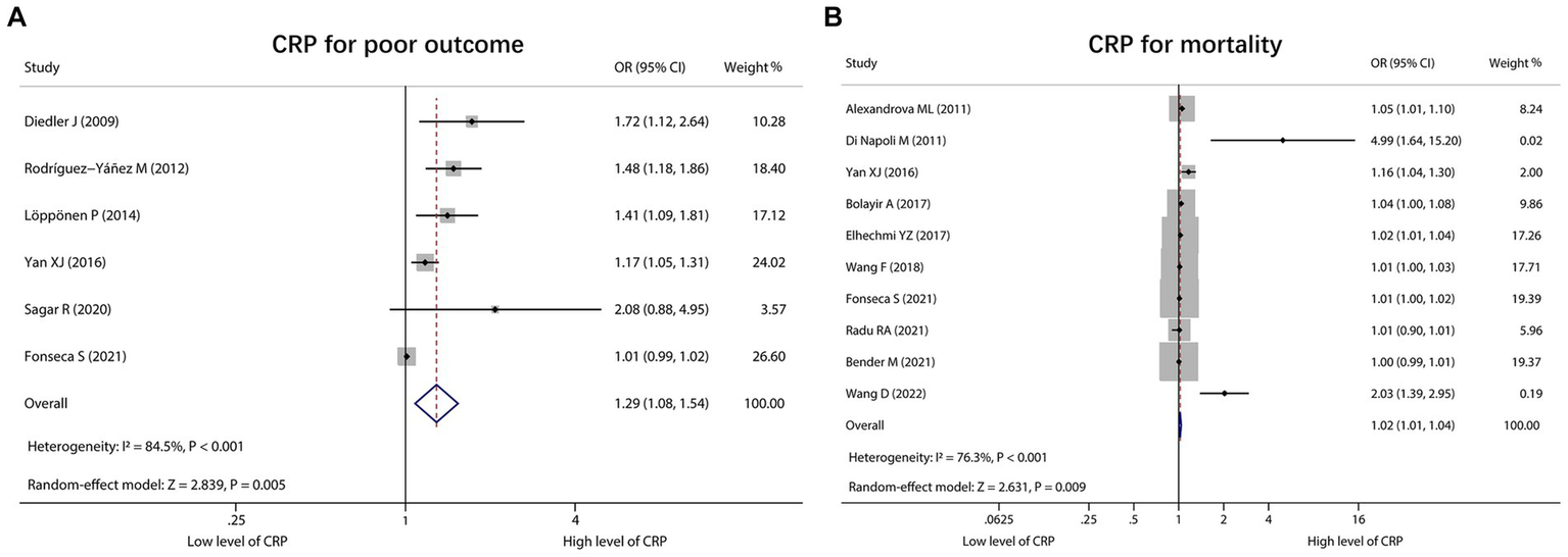 A total of 6 studies reported CRP for predicting poor outcome, and heterogeneity existed among these studies (I2 = 84.5%, p < 0.001). The pooled analysis indicated that the high level of CRP was correlated with poor outcome in ICH patients [OR (95% CI): 1.29 (1.08, 1.54), p = 0.005] (Figure 5A). Moreover, 10 studies reported CRP for forecasting mortality. Heterogeneity existed among these studies (I2 = 76.3%, p < 0.001). The pooled analysis disclosed that CRP was associated with raised mortality in ICH patients [OR (95% CI): 1.02 (1.01, 1.04), p = 0.009] (Figure 5B).