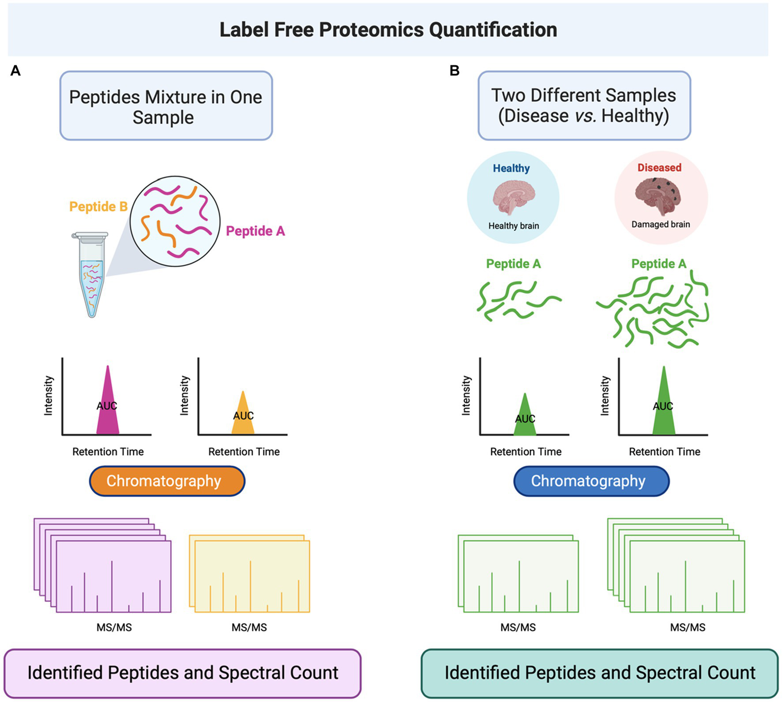 Label-free quantitation proteomics is performed by determining the area under the curve (AUC) of peptides eluted from the liquid chromatography and conjugated to MS/MS. (A) The label-free method can be applied to a single sample containing a mixture of peptides. (B) The method can also be applied to different samples (such as healthy and disease-representing cells) to quantify a specific peptide in the two cell populations. Abbreviations: Tandem mass spectrometry (MS/MS).