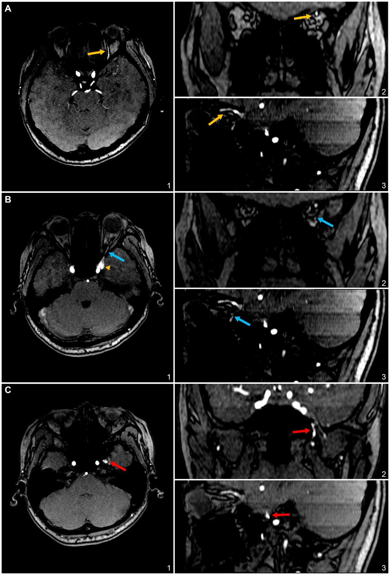 3D time-of-flight (TOF) magnetic resonance (MR) angiography slices highlighting the involved efferent venous pathways of the sphenoid wing (SW)-DAVF in this case. (A) Axial (1), coronal (2), and sagittal (3) slices depict the superior ophthalmic vein (SOV) as an efferent pathway, denoted by yellow arrows. (B) Axial (1), coronal (2), and sagittal (3) slices illustrate the inferior ophthalmic vein as a potential efferent pathway, indicated by blue arrows. (C) Axial (1), coronal (2), and sagittal (3) slices display the pterygoid plexus, marked with red arrows.