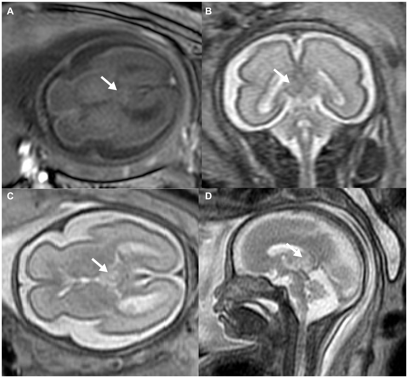 Prenatal MRI of fetal intracranial medulloepithelioma. MRI of the fetal brain: axial view of T1WI (A), coronal (B), axial (C), and sagittal (D) view of T2WI; white arrow indicates the tumor.