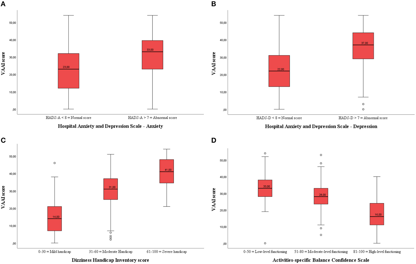 Participants with vestibular disorders report a higher psychological burden compared to healthy adults. These results emphasize the importance of assessing psychological factors in persons with vestibular disorders. In addition, evidence was provided for convergent validity, supporting the VAAI as a valid outcome measure across cultures.