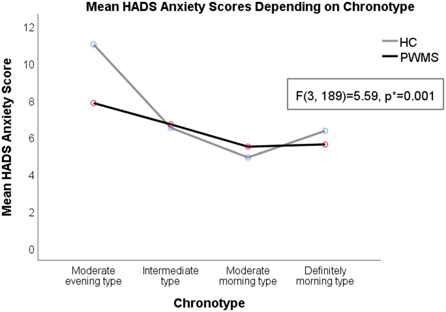 Anxiety symptoms in PWMS and healthy controls with different chronotypes. HADS, Hospital Anxiety and Depression Scale; HC, healthy controls; PWMS, patients with multiple sclerosis. *Two-way ANOVA.