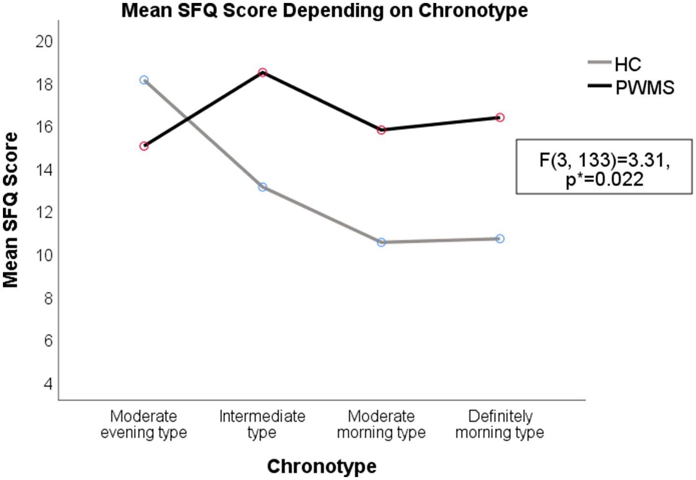 Higher average HADS depression scores were observed in both PWMS and healthy controls with the moderate evening (6.25 ± 0.71) and intermediate chronotypes (5.1 ± 0.32) than in those with moderate morning chronotypes (3.86 ± 0.48) (F(3, 189) = 3.28, p = 0.022). Higher average HADS anxiety scores (9.42 ± 0.86) were observed in respondents with evening chronotypes than in respondents with other chronotypes (F(3, 189) = 5.59, p = 0.001). The average SFQ score was higher among PWMS (17.17 ± 6.24) than among healthy controls (12.84 ± 4.99) (t(139) = −4.34, p < 0.001).