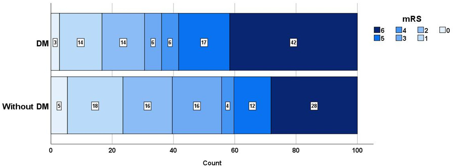 mRS distribution in patients with DM and without DM. mRS, Indicate modified Rankin scale; DM, Diabetes mellitus.