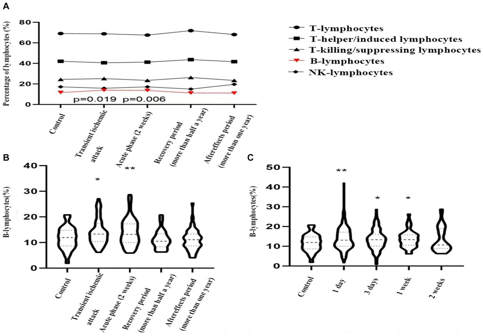 Based on the timing of cerebral ischemic events, patients were divided into the acute phase, recovery phase, and sequelae phase. A total of 60 patients with acute ischemic strokes were randomly selected. In addition, 55 patients with transient ischemic attacks, 21 patients in the recovery phase, and 47 patients in the sequelae phase were enrolled. The proportions of various lymphocyte subpopulations in these groups were compared to a control group of 60 patients with dizziness/vertigo. No significant differences were observed in the proportions of T lymphocytes, T helper/inducer lymphocytes, T cytotoxic/suppressor lymphocytes, or NK lymphocytes compared to the control group. However, the proportion of B lymphocytes was significantly higher in both transient ischemic attack (13.9 ± 5.1% vs. 11.7 ± 4.4%, p = 0.019) and acute ischemic stroke (14.1 ± 5.3% vs. 11.7 ± 4.4%, p = 0.006) groups compared to the control group, indicating statistical significance (see Figures 2A,B).