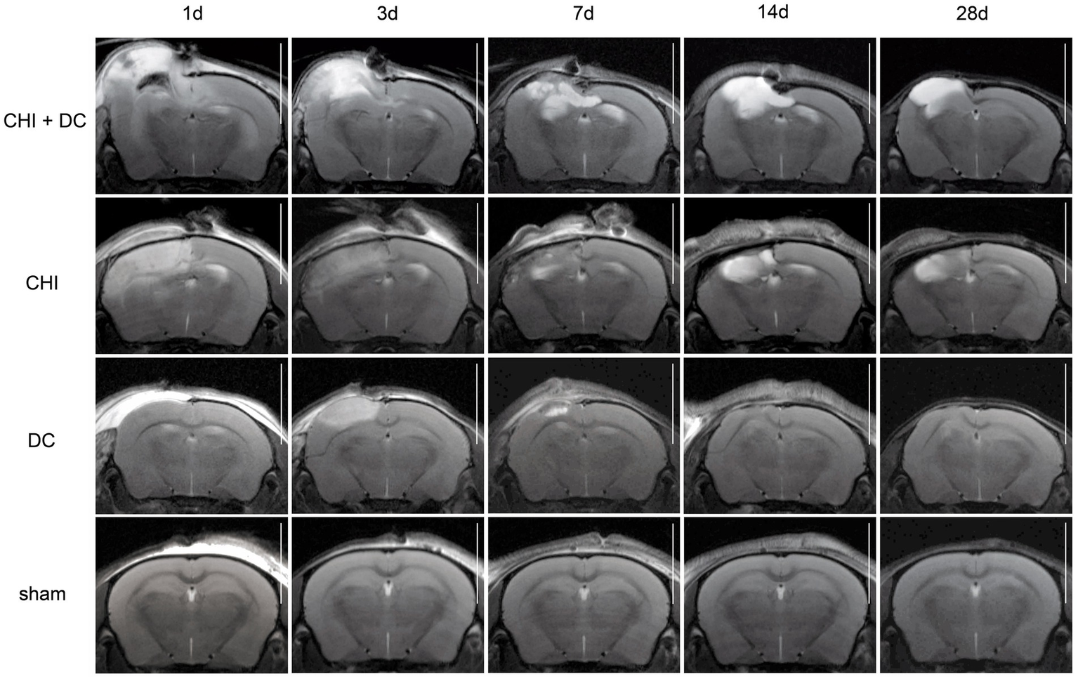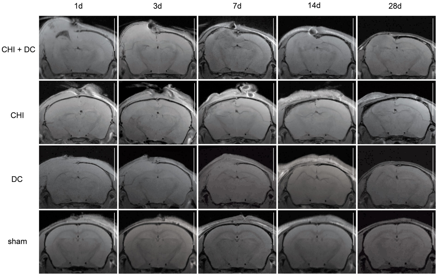 Figure 5. Panels of images representing the time course of radiological changes after trauma/decompressive craniectomy: time course (horizontal) vs. different treatment groups (vertical). Here, the MRI scans as T1-weighted images are presented. See description and interpretation of radiological changes in the main text. The scans were obtained in representative animals (each row demonstrates the radiological course in the same animal) using a 9.4 Tesla MRI scanner; white bar = 5 mm.