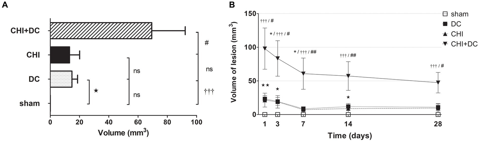 , p < 0.05). (B) Graph demonstrating the time course of total lesion volume. The description of significant differences between the groups is single-noted, referring to comparisons between CHI+DC vs. DC (*), CHI+DC vs. sham (†) and CHI+DC vs. CHI (#); the additional symbols describe the significance of differences between DC vs. sham (