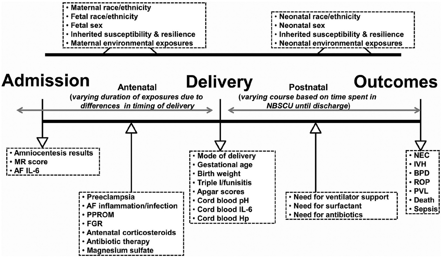 Systemic disease treatments during pregnancy inadvertently contribute to fetal brain injury. Antibiotic administration to treat maternal genitourinary infections, for example, potentially alters fetal gut microbiota and impairs fetal neuronal cell development through exaggerated inflammatory disease pathways across the developing fetal neurovascular unit. Treatments may also disrupt placental inflammatory pathways that further contribute to fetal brain maldevelopment. Prenatal exposures later predispose the preterm neonate to systemic diseases such as necrotizing enterocolitis and sepsis (72). Postnatal brain injuries result through inflammatory, oxidative stress, and asphyxial neonatal disease pathways.