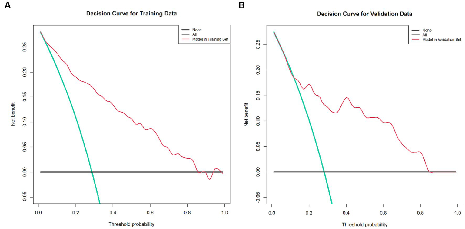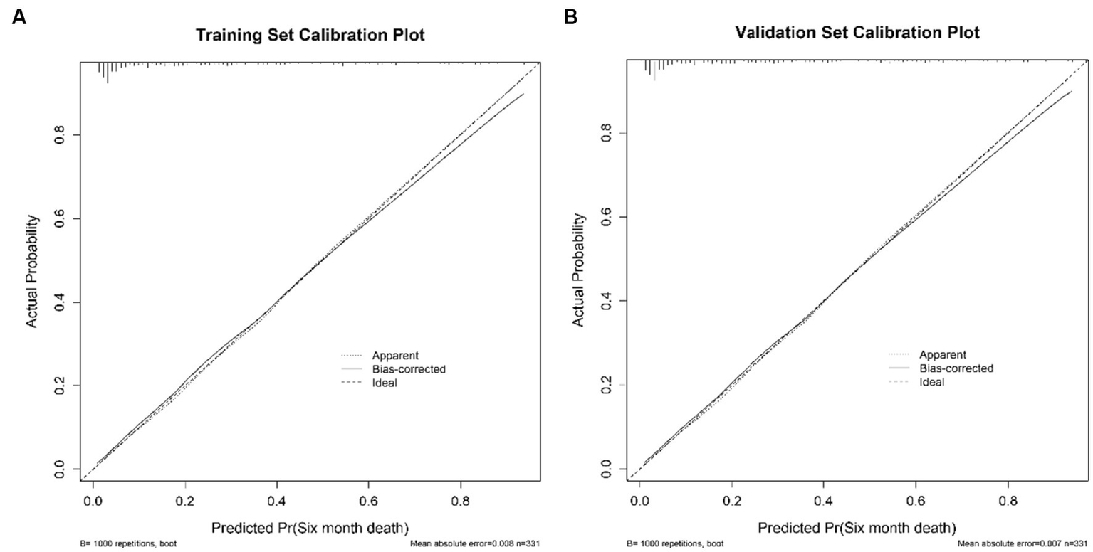 In the development of the nomogram, we initially employed the Least Absolute Shrinkage and Selection Operator (LASSO) regression method, which is notably effective in handling high-dimensional data, thereby facilitating the selection of relevant variables. These variables were then applied in logistic regression modeling using the training set. The developed nomogram was subsequently subjected to rigorous external validation using a separate validation set. The model’s discriminative capacity was quantified by the concordance index (C-index), and a calibration plot, constructed from 10,000 bootstrap resamples, was used to assess the congruence between the predicted mortality outcomes and those observed in the validation set.
