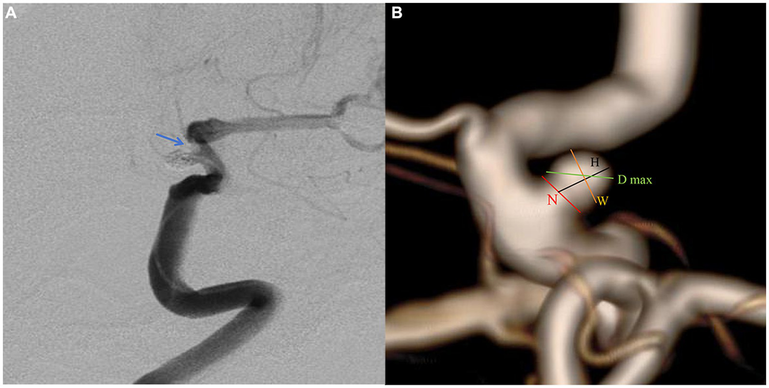 Figure 2. A paraclniod aneurysm of two-dimension and three-dimension digital subtraction angiography (DSA). (A) Two-dimension DSA showing the in-stent thrombosis (blue arrow). (B) The definition of morphologic variables in three-dimension DSA.