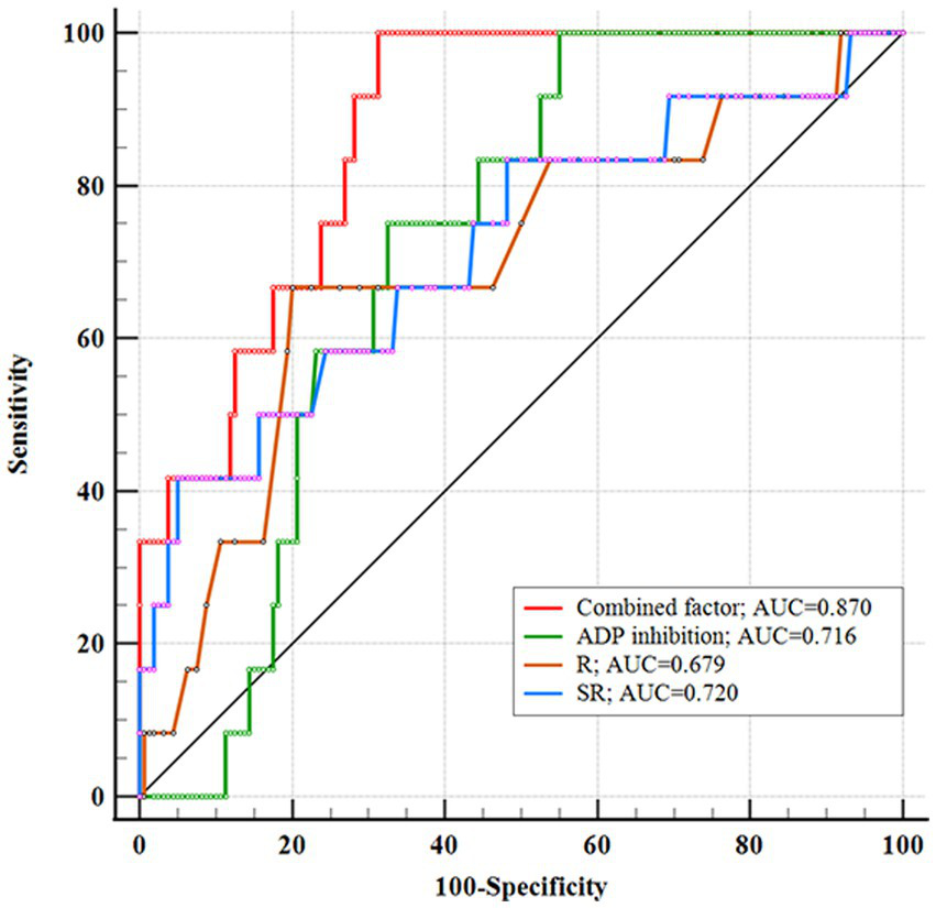 Figure 3. Receiver operating characteristic showing the area under the curve (AUC) of combined factor, SR, ADP inhibition, and R. The combined factor integrating SR, ADP inhibition, and R performed high performance.