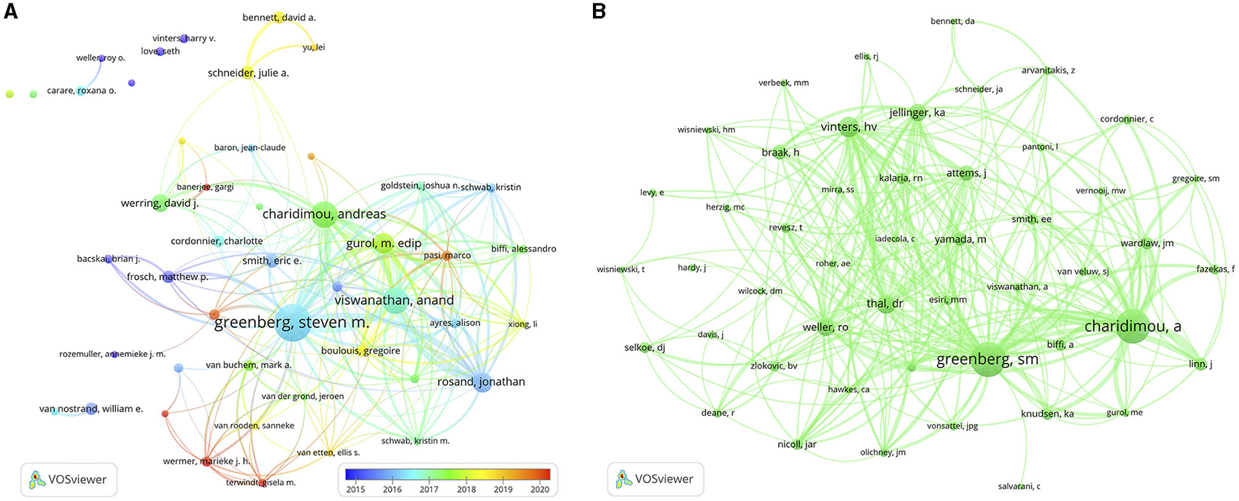 A total of 12,917 authors have made contributions to CAA research. Three authors out of the top 15 published more than 100 papers each (Table 2). We created a collaborative network according to authors with a publication count equal to or greater than 19 (Figure 4A). Greenberg, Charidimou, and Viswanathan had the largest nodes due to their extensive publications. Furthermore, we noticed close collaborations among numerous authors. For example, Greenberg, Charidimou, Viswanathan, Gurol, Rosand, Smith, and Frosch exhibited a strong collaborative relationship.