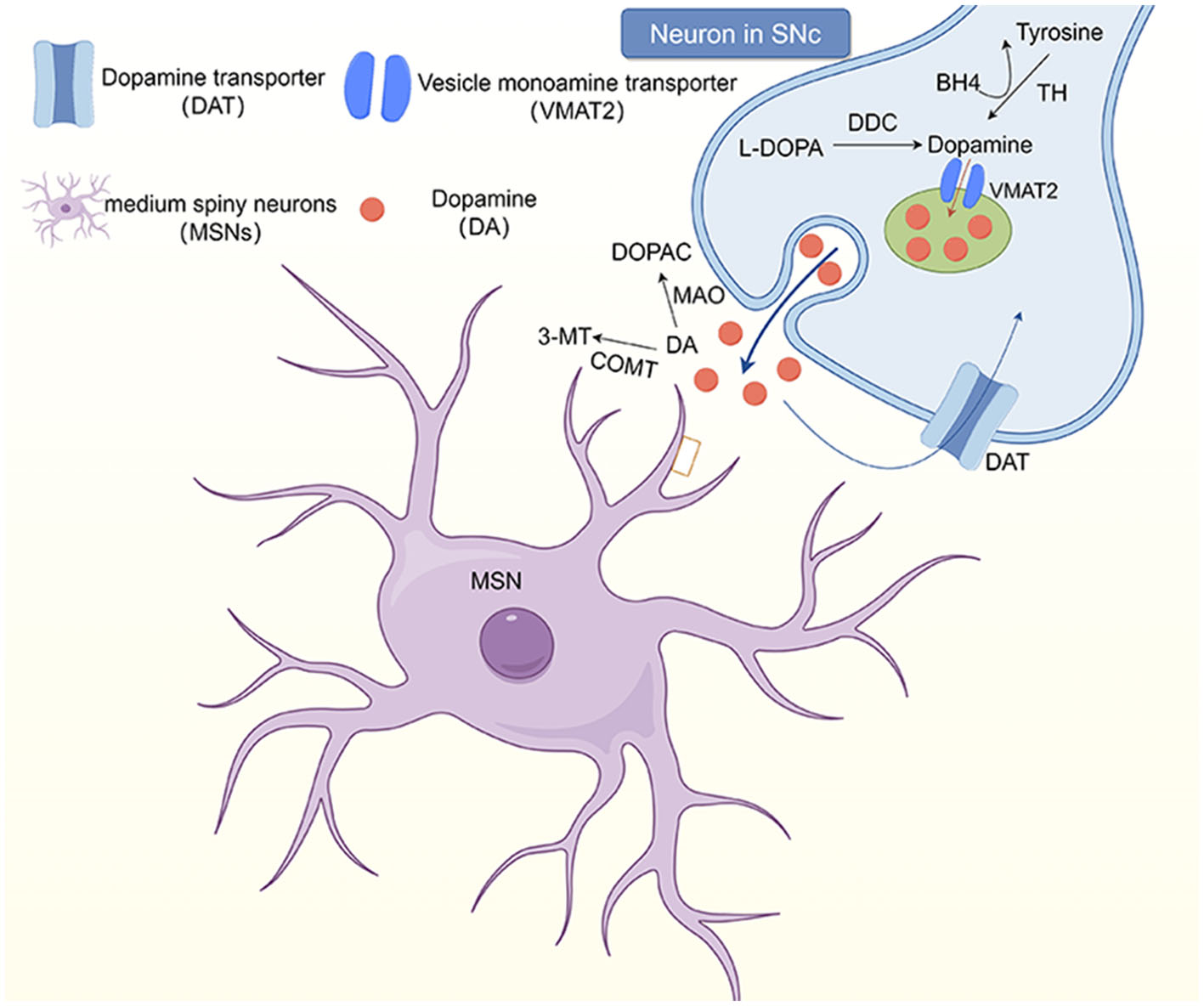 The dopaminergic system in the striatum. Neurons in the substantia nigra pars comoacta (SNc) receive dopaminergic input through the substantia striatum pathway. At the synaptic level, tyrosine hydroxylase (TH) uses tetrahydrobiopterin (BH4) as a cofactor to convert to tyrosine, which then synthesizes dopamine at the presynaptic terminal. Dopamine (DA) and other monoamines are introduced into vesicles at the presynaptic terminal by vesicular monoamine transporters (VMAT2). However, monoamines are released into the synaptic gap and bind to postsynaptic receptors, including dopamine receptors (D1-5). DA in the synaptic gap is degraded by monoamine oxidase and catechol-oxo-methyltransferase (COMT) to 3, 4-dihydroxyphenylacetic acid (DOPAC) and 3-methoxytyramine (3-MT), respectively, and transported back to the presynaptic terminal.