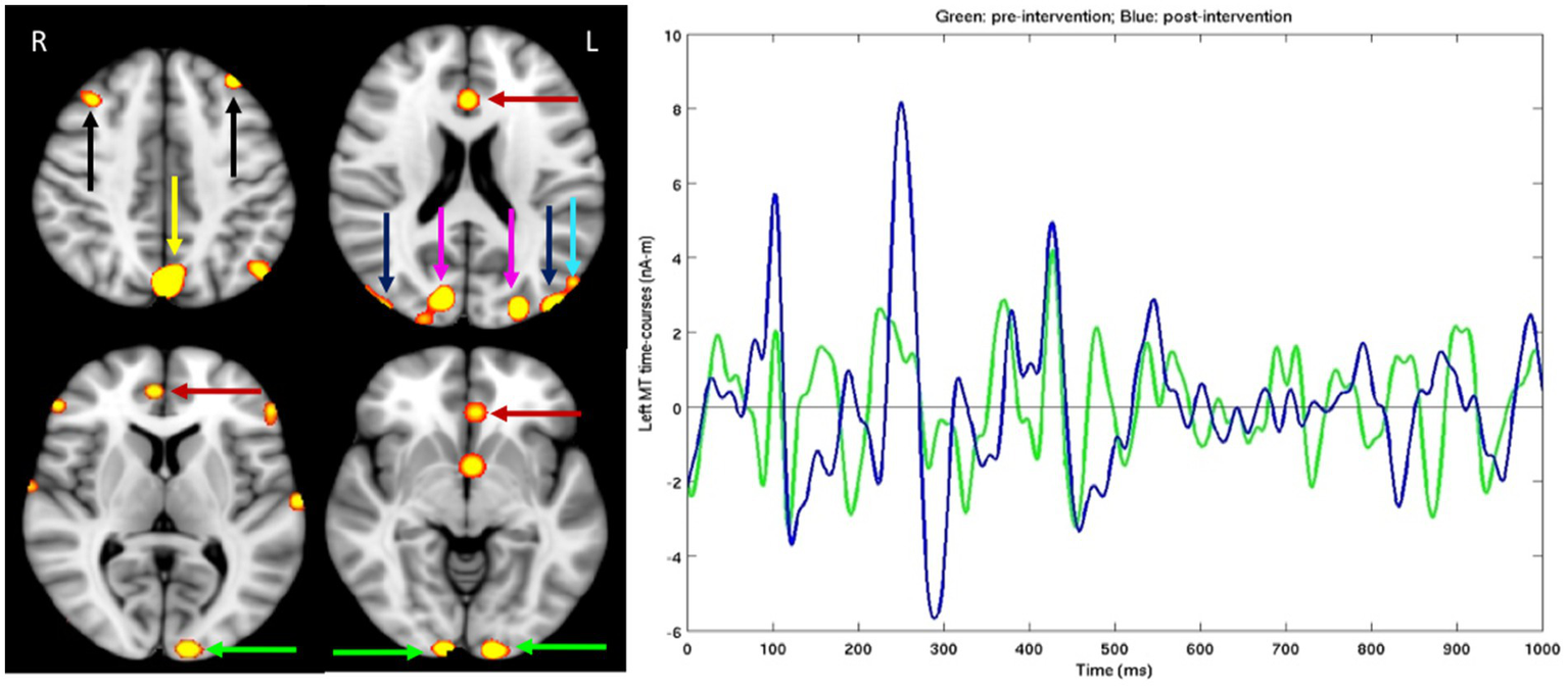 For dyslexic subject, after standardized tests were administered MEG brain imaging before and after the PATH neurotraining intervention was completed. Left Panel: Different slices from the left (L) and right (R) sides of the brain. Hot spots showing significant MEG source magnitude (i.e., root-mean-square measure) signal increases were computed from mean square measure of MEG signal increases for the 0–1,000 ms time interval following the stimulus onset in post- versus pre-intervention exams, for an adult male dyslexic aged 29 years. Familywise error was corrected for multiple comparison across spatial voxels using standard cluster analysis. For those hot spots, the corrected value of p thresholds were at p = 0.01 for red, and p = 0.001 for bright yellow color. Green arrows: Visual Area 1 (V1); Blue arrows: Middle Temporal (MT) cortex; Magenta arrows: visual Area 3 (V3); Cyan arrow: Medial Superior Temporal (MST) cortex; Red arrows: Anterior Cingulate Cortex (ACC); Yellow arrow: precuneus/Posterior Cingulate Cortex (PCC); Black arrows: dorsal lateral Prefrontal Cortex (dlPFC); Right Panel: MEG source time-courses from left MT area during post-intervention (Blue line) and pre-intervention (Green line) exams in the figure above.