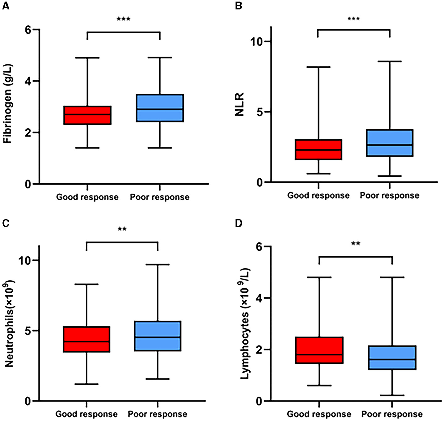 Comparisons of the plasma fibrinogen level (A), NLR (B), neutrophil count (C), and lymphocyte count (D) between the good response and poor response groups. **P < 0.01, ***P < 0.001.