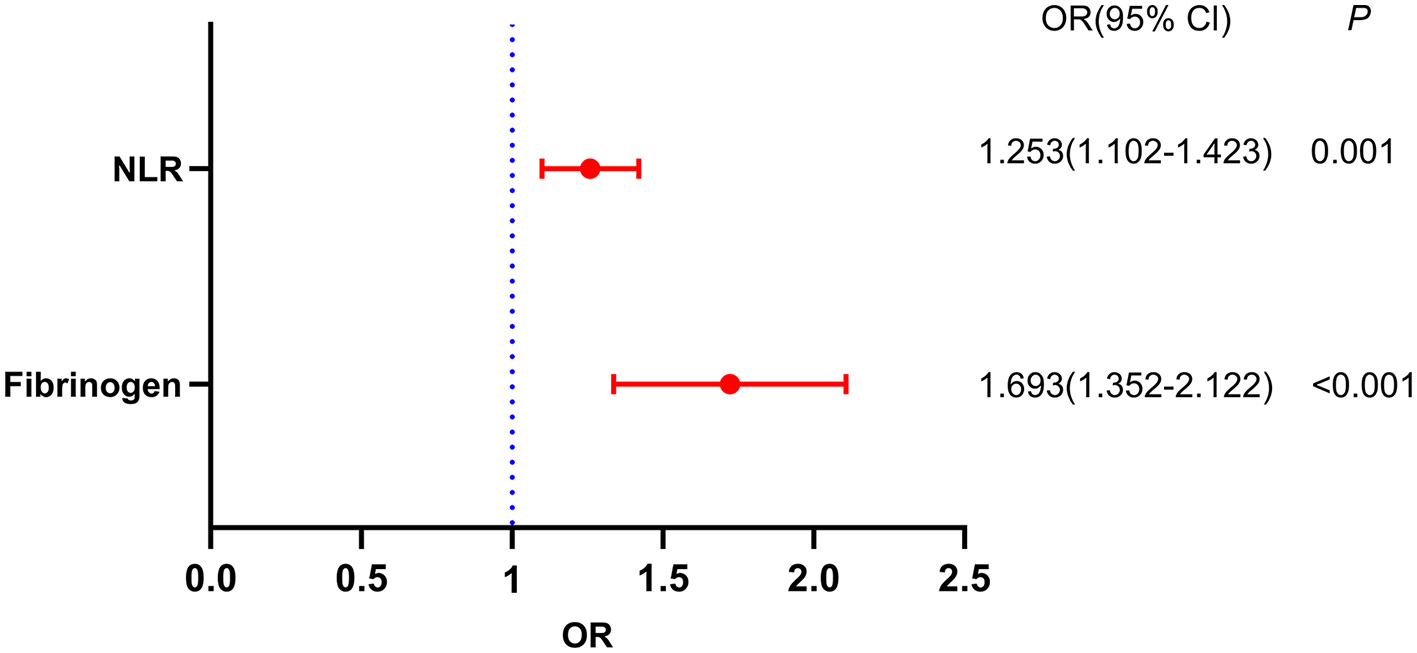 Table 2 illustrates the results of crude models for a poor response to thrombolysis. Factors with statistical significance in Table 1 were included in the binary logistic regression model to identify independent risk factors for a poor response to thrombolysis. Notably, the neutrophil and lymphocyte counts were not included in the model due to collinearity with the NLR and PLR. After adjustment for all potential confounders, such as age, hypertension, diabetes mellitus, atrial fibrillation, hemoglobin and PLR, an elevated NLR (OR, 1.253; 95% CI, 1.102–1.423, P = 0.001) and fibrinogen level (OR, 1.693; 95% CI, 1.352–2.122, P < 0.001) were identified as independent factors for a poor response to thrombolysis (Figure 3).