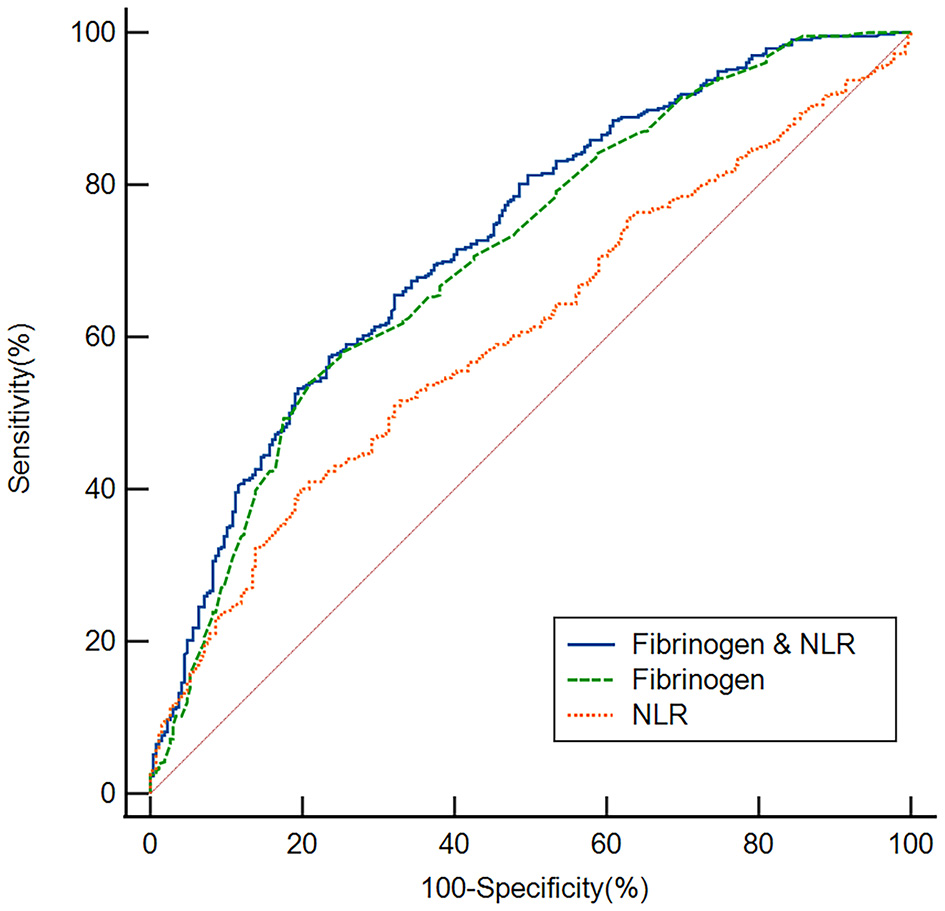 We employed ROC curves to test the overall ability of the fibrinogen level and NLR to discriminate poor responders to thrombolysis (Figure 4). We observed that the area under the curve (AUC) of the fibrinogen level to discriminate poor responders to thrombolysis was 0.708 (95% CI, 0.673–0.742, P < 0.001), the optimal cutoff was 3.04, and the sensitivity and specificity were 53.94% and 79.10%, respectively. The AUC of the NLR was 0.605 (95% CI, 0.568–0.642, P < 0.001), the cutoff was 3.25, and the sensitivity and specificity were 39.58% and 80.60%, respectively. In addition, we conducted an ROC curve analysis for the ability of the combination of the fibrinogen level and NLR to discriminate between good responders and poor responders to thrombolysis. The AUC for the combination of the NLR and fibrinogen level was 0.728 (95% CI, 0.693–0.760, P < 0.001), the cutoff was 0.64, and the sensitivity and specificity were 57.41% and 76.49%, respectively.