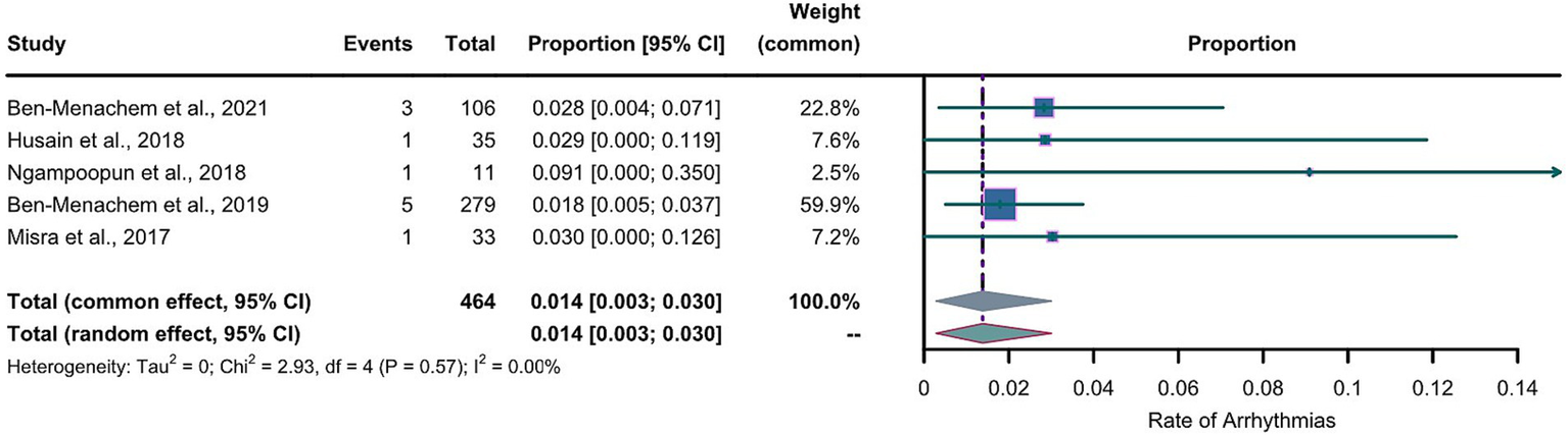 Forest plot of arrhythmia incidence in the LCM group. The pooled incidence of arrhythmias in LCM group is 0.014 (0.003-0.030) with the common effect model.