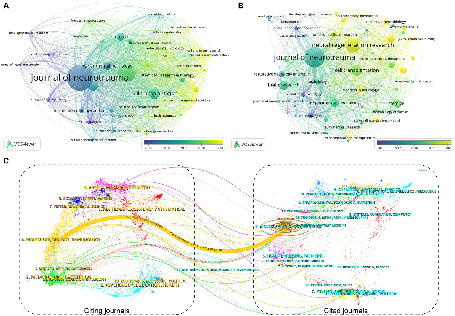 The visualization of journal coupling map (A) and citation map (B) generated by Vosviewer. (C) The dual-map overlay of academic journals in the field of TBI and stem cell research generated by CiteSpace.
