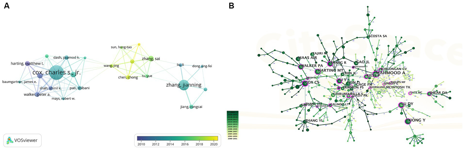 (A) Overlay visualization map of author co-authorship analysis generated by VOSviewer. (B) Visualization map of author co-citation analysis by using CiteSpace software.