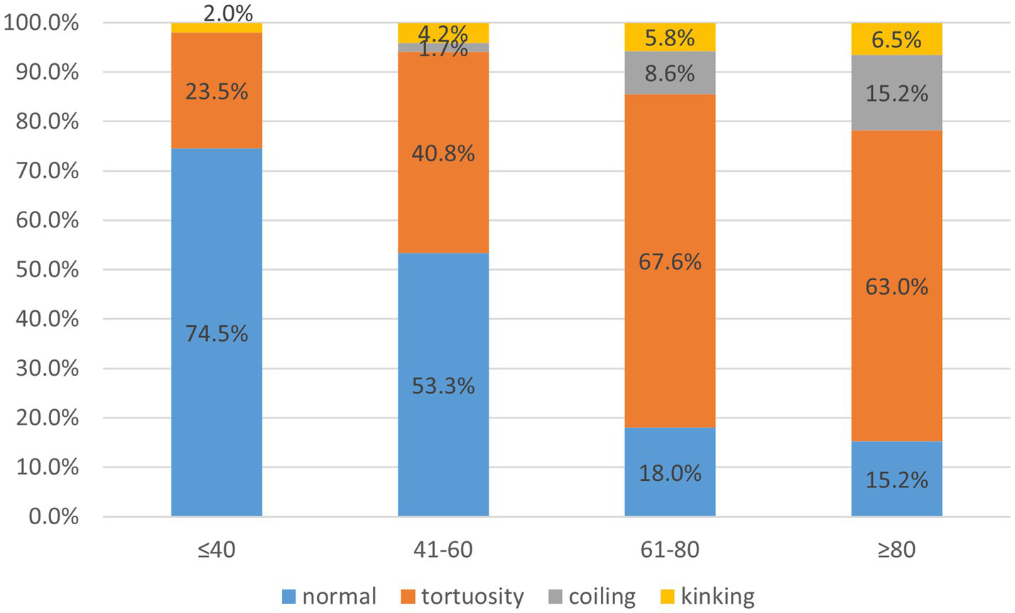 Percentages of different kinds of tortuosity in each age group.