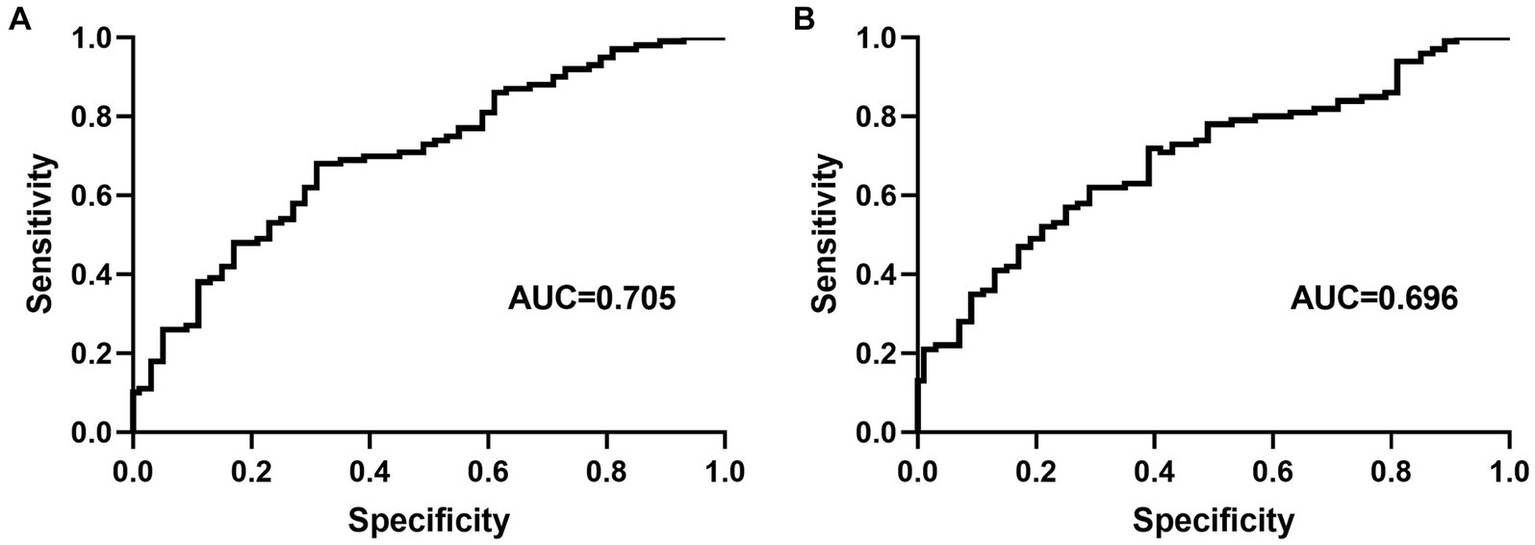 Receiver operating characteristic curve for age (A) and duration of hypertension (B) for predicting carotid artery tortuosity. AUC = area under the curve.