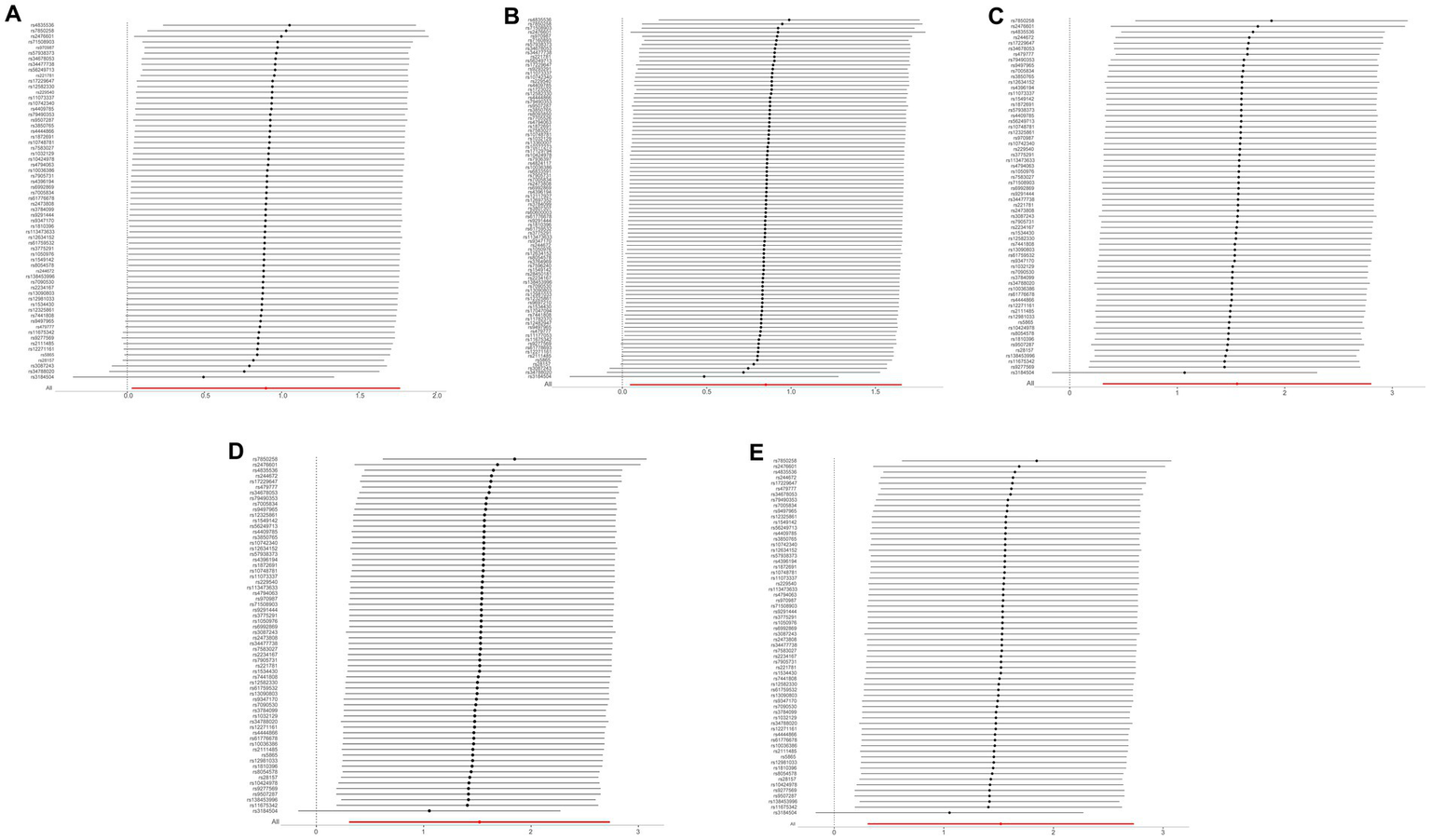 To evaluate the potential for horizontal multiplicity, we used the MR-Egger intercept term test, which has p > 0.05, indicating that horizontal multiplicity is missing (13). Through the application of the Egger-intercept method, as referenced in prior research (14), the analysis provided evidence for the absence of lateral pleiotropy, a phenomenon that could have potentially skewed the results. The statistical insignificance marked by a p-value greater than 0.05 further substantiates this finding, reinforcing the robustness of the result and aligning with the expectations of the study’s hypothesis. The MR-PRESSO test, utilized to identify horizontal pleiotropy anomalies, produced a p-value above 0.05, further affirming the non-existence of horizontal pleiotropy and the presence of outliers. The influence of each SNP on the outcomes was evaluated by sequentially omitting individual SNPs using the “leave-one-out” method (15). Cochran’s Q test was employed to evaluate heterogeneity within singular genetic variance estimations, with p > 0.05, denoting an absence of heterogeneity. All analytical procedures were diligently executed in the R software environment, specifically 4.1.3 version, esteemed for reliability in statistical analyses. For the MR investigation, we employed the “Two-Sample-MR” and “MR-PRESSO” packages, both of which are recognized for their specialized functionalities tailored for genetic causal inference tasks. Additionally, the “Meta” package was judiciously employed to conduct the meta-analysis, streamlining the integration and synthesis of results across different studies and thereby enhancing the rigor and comprehensiveness of our findings.