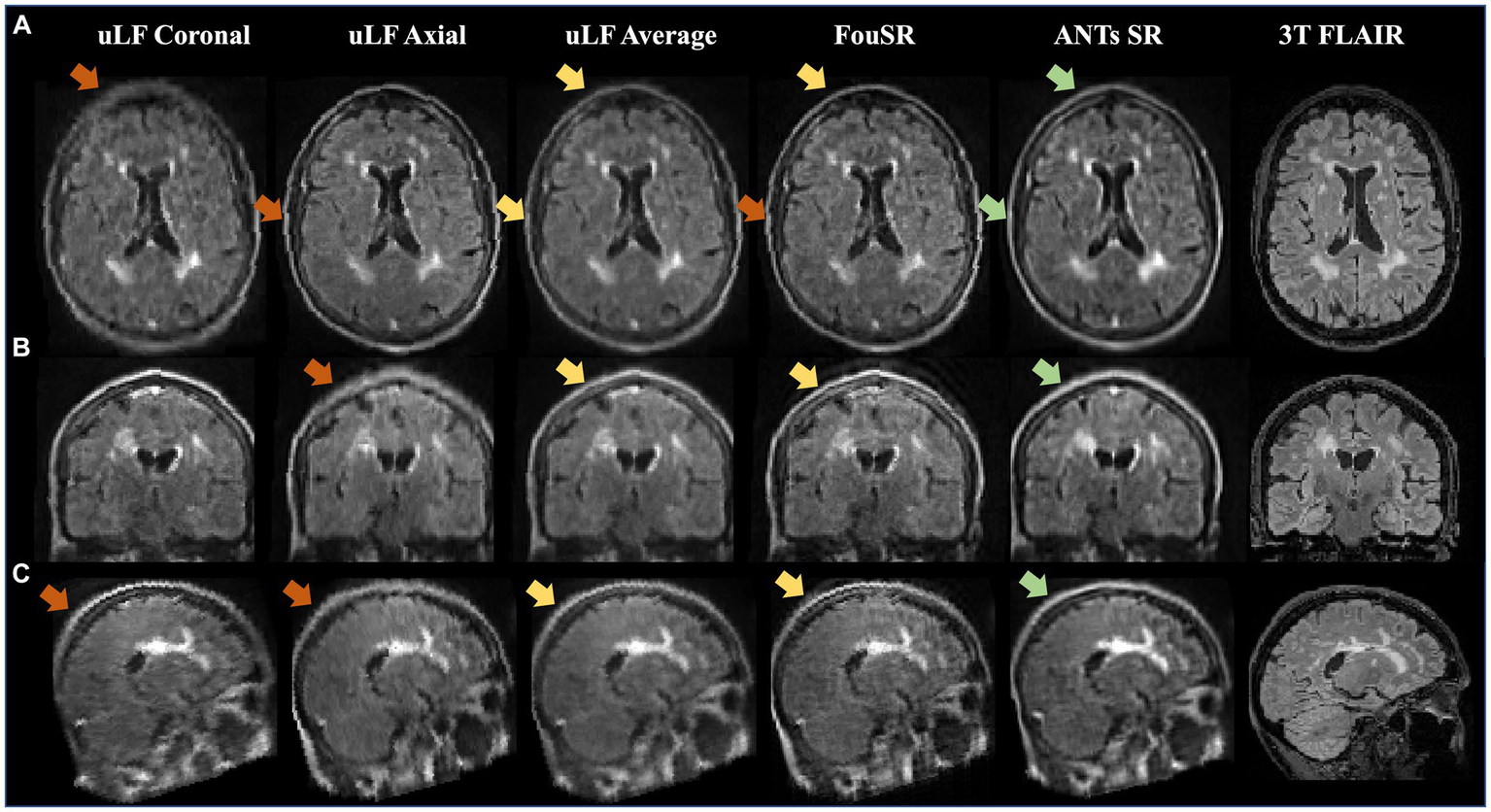 Figure 5 presents an example of a participant with a high lesion burden. Notably, FouSR in Figure 5, column 3, shows enhanced resolution across all three axes, surpassing the through-plane resolution of the ULF coronal and ULF axial scans, suggesting the recovery of information from the in-plane voxels of the ULF coronal (Figure 5, column 1) and ULF axial images (Figure 5A, column 2). FouSR demonstrated improved image quality relative to the ULF coronal and ULF axial images in the slice direction. ULF average and ANTs displayed more pronounced blurring along lesion edges and sulci than the FouSR approach. Importantly, certain artifacts visible in the ULF coronal and axial images (Figure 5C, arrows) were consistently retained in the FouSR and ANTs-SR images, although they exhibited reduced visibility in the ULF average. Additionally, ringing artifacts were introduced in FouSR (Figure 5C, box), which were not visible in other scans.