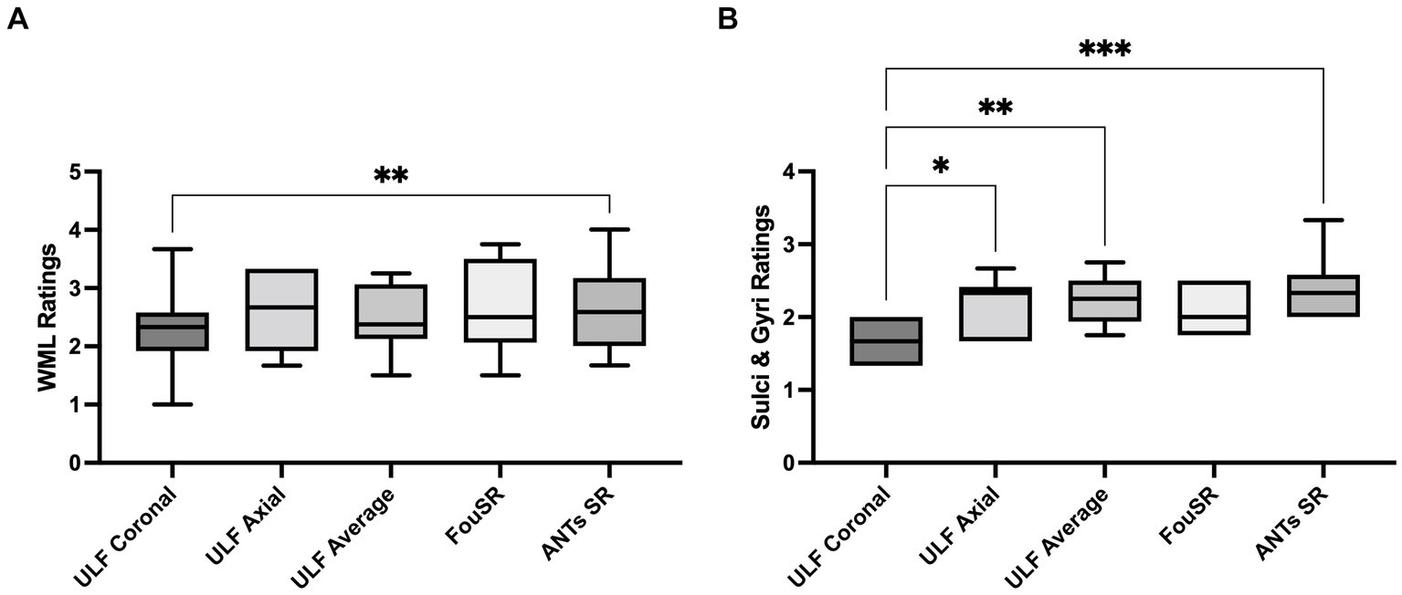 ANTs SR had the highest mean WML ratings (2.68 ± 0.78) followed by FouSR (2.67 ± 0.81) and ULF axial (2.2 ± 0.40) (Figure 7A). Only ANTs SR showed a significant difference from ULF coronal (2.3 ± 0.76). ANTs SR (2.43 ± 0.50), ULF average (2.2 ± 0.33) and ULF axial (2.2 ± 0.40) had significantly higher sulci and gyri ratings compared to ULF coronal (1.65 ± 0.27) (Figure 7B). FouSR (2.1 ± 0.32) had a comparable mean sulci and gyri rating and was not significantly different from other methods. While FouSR exhibited superior sharpness, ULF average and ANTs SR maintained more uniform intensities within tissue categories, particularly in the WM. This uniformity in intensity is crucial for the visual identification of anatomical landmarks and lesions. It is worth noting that while ANTs-SR may not be easily implementable on the scanner, it does offer a visually appealing smoothing effect.