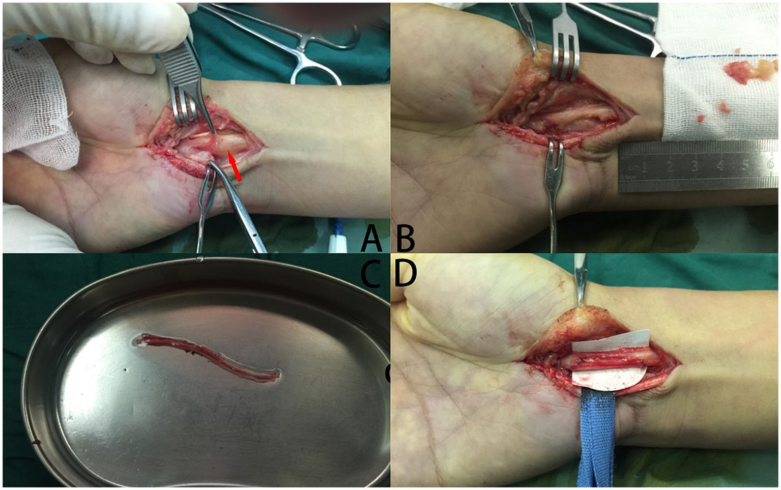 The procedure of tumor resection in the median nerve and a sural nerve graft. (A) A tumor (red arrowhead) grew in the median nerve, which was encased by the nerve tissue. (B) The tumor was excised, which causes the median nerve defects. (C) The sural nerve has been incised. (D) Postoperative images of autologous nerve transplantation.