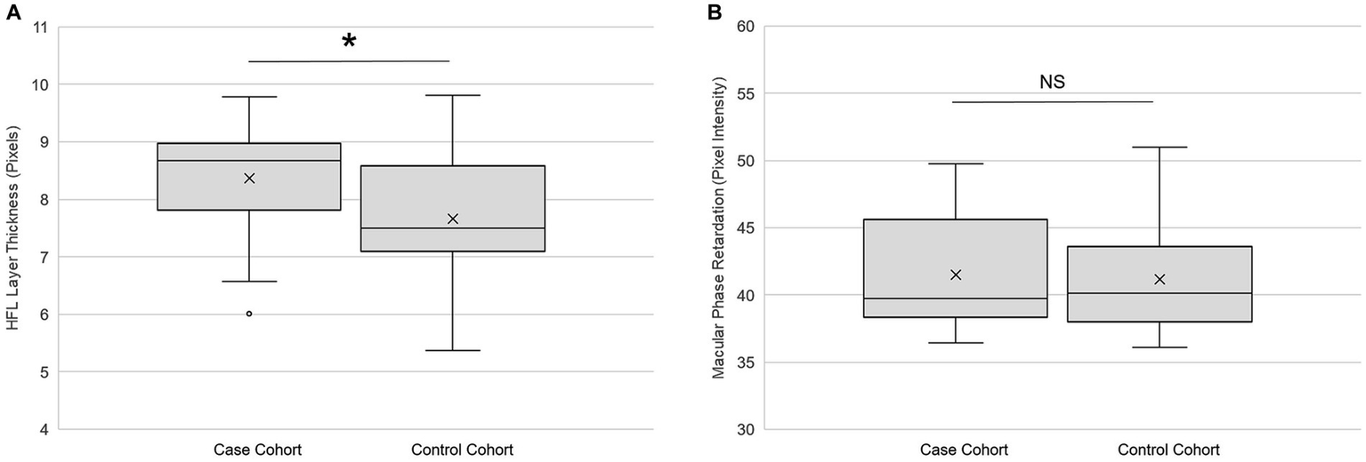 Retinal imaging primary outcomes. (A) Global Henle fiber layer thickness (n = 25) and (B) global macular phase retardation (n = 24) in both the case and the control cohorts. Each box represents the interquartile range, and the internal line is the median. The internal “X” is the mean. The whiskers represent the 90th and 10th percentiles, and open circles are outlying values. Phase retardation data for one case participant were not collected due to a technical difficulty. *p < 0.05, paired t-test. NS is not statistically significant. Statistical significance threshold α = 0.05.