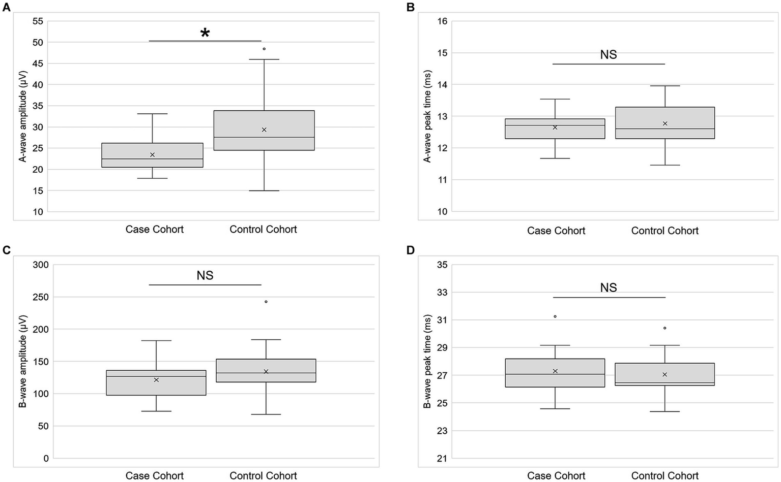 A-wave amplitude and peak time and b-wave amplitude and peak time of the LA 3.0 condition were the primary outcomes. These primary outcomes were determined before data collection and were selected for ease of future clinical implementation. All other fERG parameters were considered secondary outcomes. Two-tailed paired t-tests analyzed differences between the cohorts for normally distributed outcomes, and Wilcoxon signed-rank tests analyzed differences between the cohorts for non-normally distributed outcomes (α = 0.05 for the primary outcomes, and α = 0.0011 for the secondary outcomes). Cohen’s d was calculated for all outcome measures as a metric of effect size.