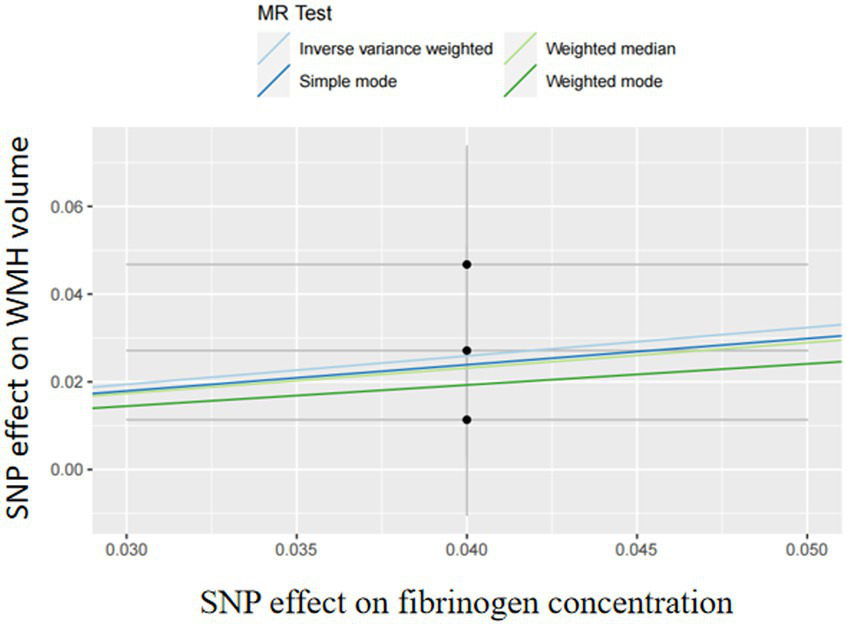 In two-sample MR analyses, the authors identified nine and three SNPs as IVs in our MR analyses of D-dimer and fibrinogen on WMH, respectively. The random-effects IVW models showed that genetically predicted increased levels of D-dimer (OR,1.01; 95% CI 0.95–1.06; p = 0.81) and fibrinogen (OR,1.91; 95% CI 0.97–3.78; p = 0.06) were not associated with increased WMH volume. The authors did not obtain strong evidence of a direct causal relationship between genetically mediated coagulation markers (D-dimer and fibrinogen) and WMH. The MR-Egger and weighted-median methods were consistent with the results of the IVW analyses. There was no multiplicity and heterogeneity in sensitivity analyses for both D-dimer and fibrinogen (all p > 0.05). The MR-Egger analysis did not show any genetic correlation between fibrinogen concentration and WMH, probably because the number of exposed SNPs in fibrinogen is low (Figures 3–5; Table 6).