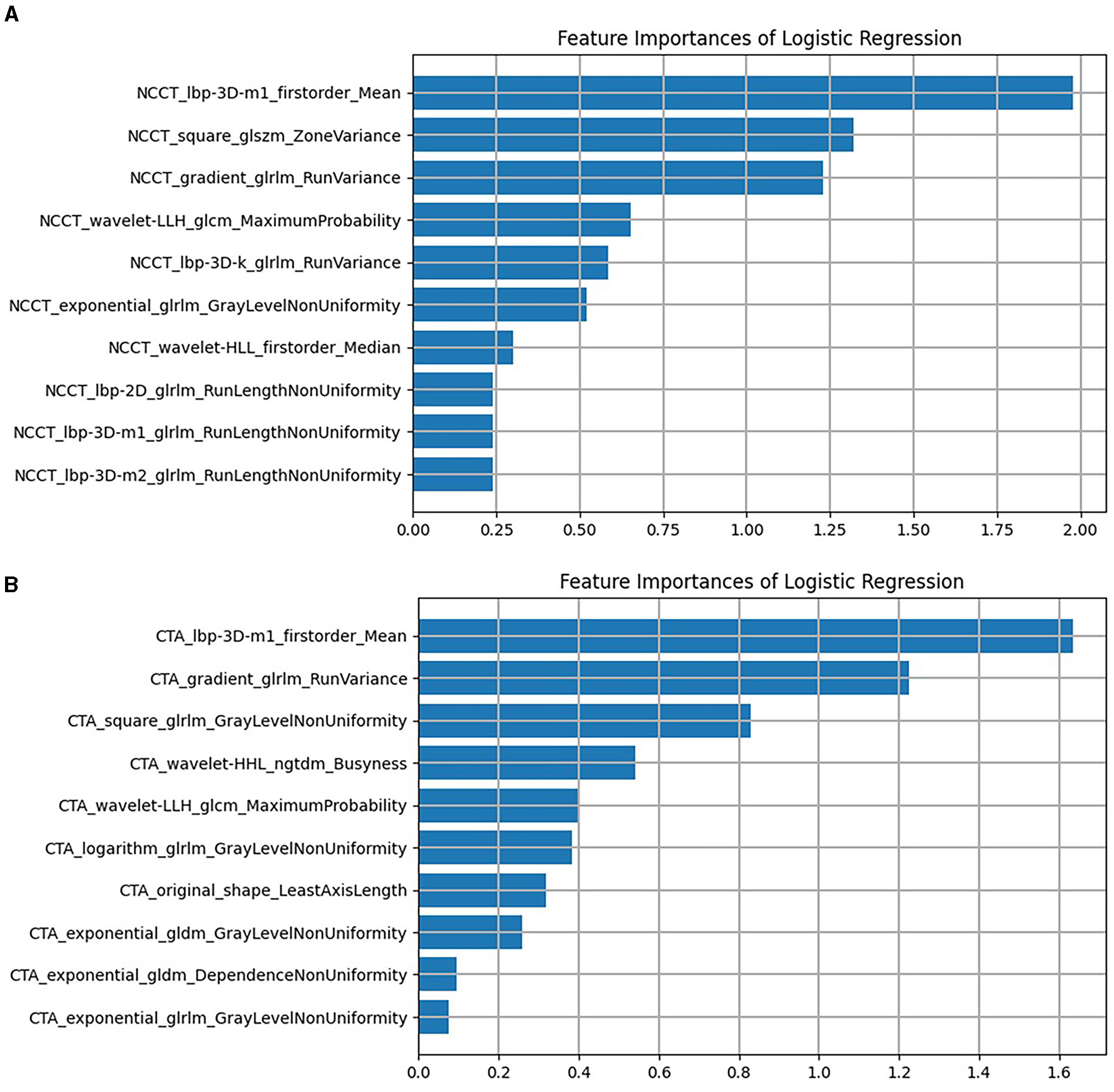 The remaining features of LASSO regression screening and the ranking of weight coefficients output by the corresponding LR classifier under (A) the NCCT model, (B) the CTA model. CTA, computed tomography angiography; LASSO, least absolute shrinkage and selection operation; LR, logistic regression; NCCT, non-contrast computed tomography.