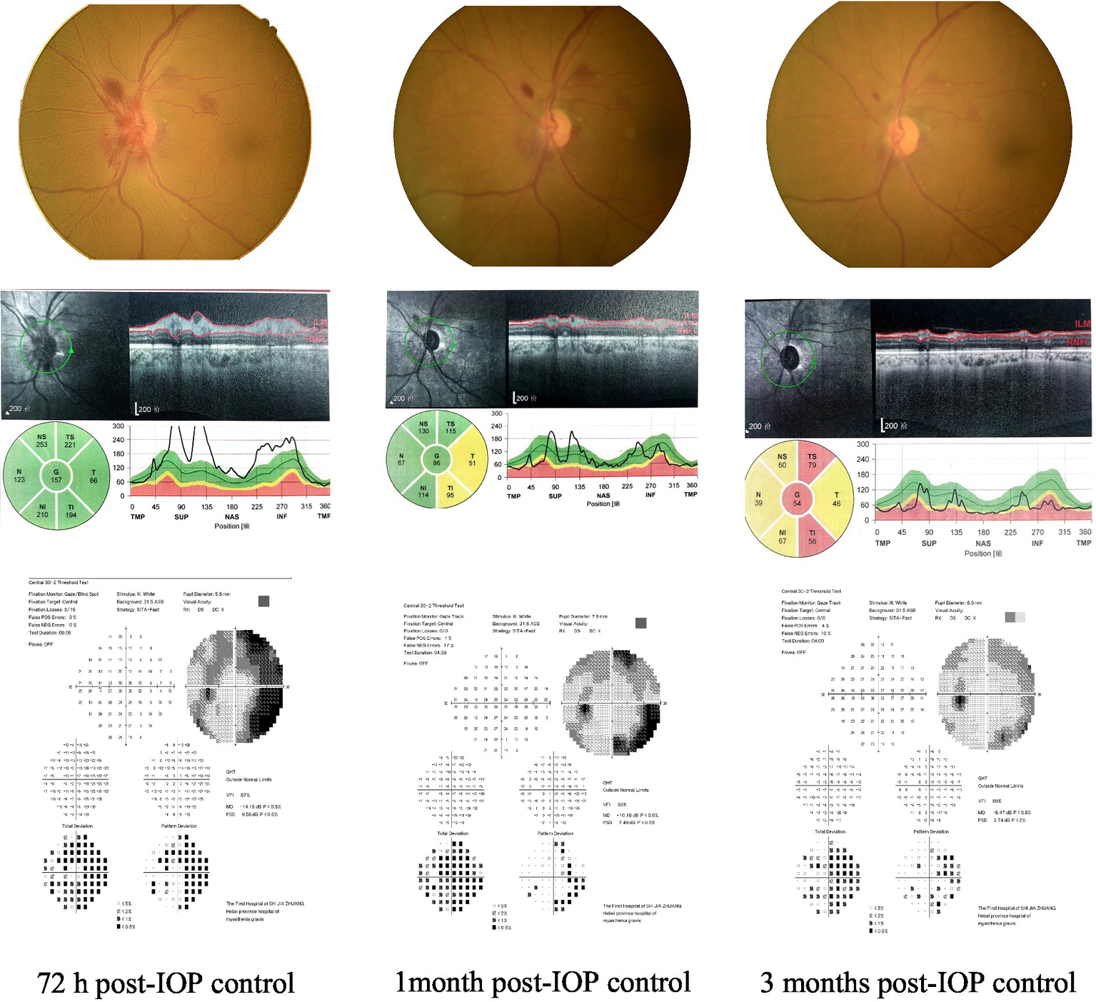 The highest IOP and its duration, ODH characteristics, best-corrected visual acuity (BCVA), RNFLT, and VF were recorded within 72 h and at 2 weeks, 1 month, 3 months, 6 months, and 12 months after IOP control. This study adhered to the principles of the Declaration of Helsinki and received approval from the Ethics Committee of Shijiazhuang People’s Hospital. All patients provided written informed consent.