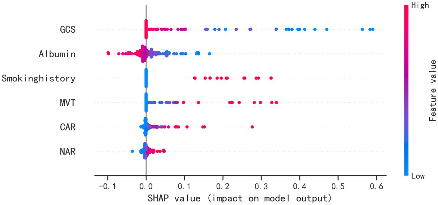 As partially relevant or less important features may negative affect performance of machine learning models, we performed feature selection by using LASSO regression. 39 variables with missing values <20% was extracted after interpolation, and 6 potential predictors were finally screened from the LASSO regression analysis (Figure 2). We included these 6 variables in multi-factor logistic regression and found that all 6 variables were statistically significant (Table 2). These 6 features were listed as follows: GCS (OR, 0.72; 95% CI, 0.58–0.73; p < 0.001), MVT (OR, 1.11; 95% CI, 1.03–1.21; p = 0.01), Albumin (OR, 0.90; 95% CI, 0.85–0.96; p < 0.001), NAR (OR, 55.23; 95% CI, 4.74–657.27; p < 0.001), CAR (OR, 2.61; 95% CI, 1.59–4.29; p < 0.001), Smoking history (OR, 8.37; 95% CI, 3.74–18.84; p < 0.001).