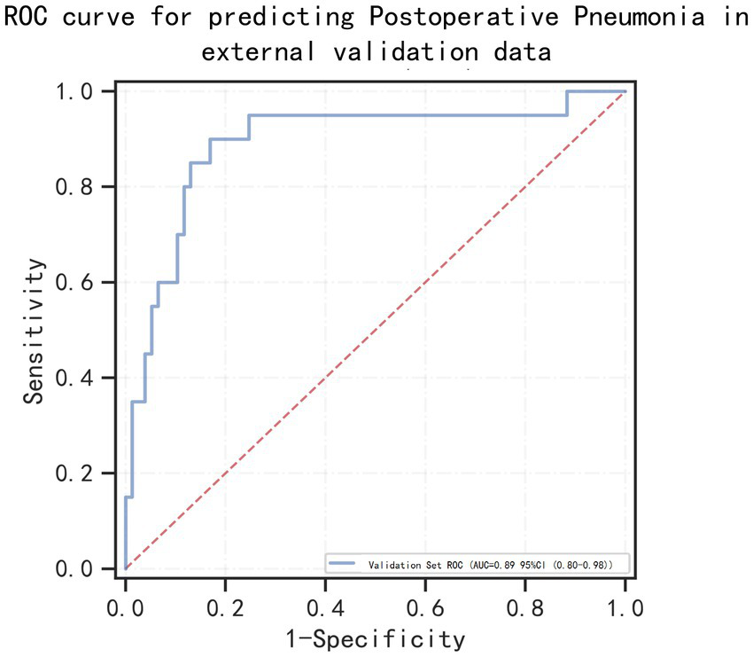 In this study, 15.01% of patients in the training set and 12.06% in the testing set with POP after underwent surgery. Multivariate logistic regression analysis showed that mechanical ventilation time (MVT), Glasgow Coma Scale (GCS), Smoking history, albumin level, neutrophil-to-albumin Ratio (NAR), c-reactive protein (CRP)-to-albumin ratio (CAR) were independent predictors of POP. The logistic regression (LR) model presented significantly better predictive performance (AUC: 0.91) than other models and also performed well in the external validation set (AUC: 0.89).