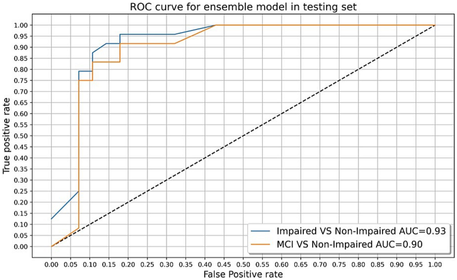 Mean logit algorithm scores were significantly different across groups in the testing sample (p < 0.01). Comparisons of CN with impaired (MCI + dementia) and MCI groups using the final algorithm resulted in an AUC of 0.93/0.90, with overall accuracy of 88.4%/87.5%, sensitivity of 87.5/83.3, and specificity of 89.2/89.2, respectively.