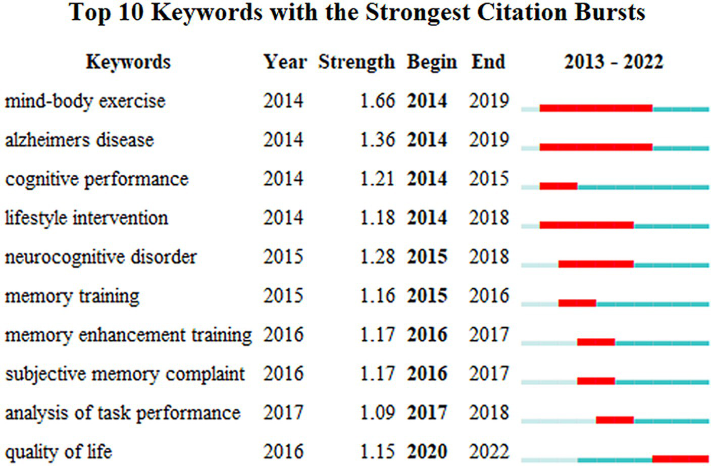 The occurrence of the author’s keywords reflects the degree of interest in the field of BME for MCI and can predict future research trends. Meanwhile, the centrality of items was calculated automatically through CiteSpace, while nodes with high centrality represented their critical or turning point significance in a particular research field (43). The 14 most frequently occurring authors’ keywords in the field of BME for MCI are shown in Table 4. MCI was the most frequently occurring keyword and had the highest centrality (0.88). Tai Chi, Older Adults, and Alzheimer’s Disease were also commonly occurring. It is clearly shown in Figure 5 that the top 10 keywords with the strongest citation bursts in the field of BME for MCI in the past decade. The blue line represents the timeline from 2013 to 2022, while the red line represents the duration of the keyword outbreak from 2013 to 2022. In the last decade, body–mind exercise (Burst = 1.66) and Alzheimer’s Disease (Burst = 1.36) were the keywords with the highest citation burst value, as well as the keywords with the longest duration of burst. Since 2020, quality of life has been the keyword with the highest burst value in the field of BME for MCI.