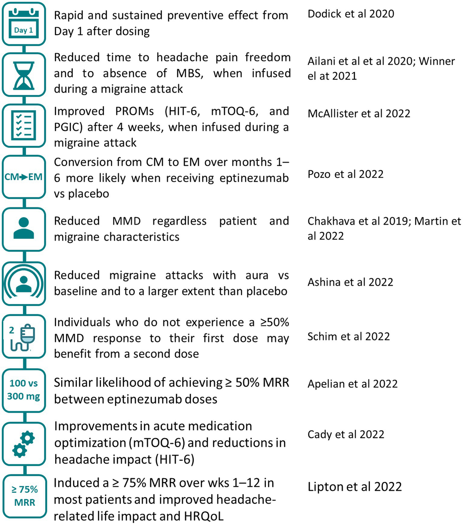 Effect of eptinezumab on migraine (EM and CM). Main conclusions regarding eptinezumab efficacy from post-hoc analysis that pooled patients from the pivotal trials (26–30, 53, 60, 61) and from studies that included patients with migraine 4–15 d/mo (24, 25, 62, 63). HIT-6, 6-item Headache Impact Test; HRQoL, health-related quality of life; MMD, monthly migraine days; MRR, migraine response rate; mTOQ-6, 6-item migraine Treatment Optimization Questionnaire; PGIC, Patient Global Impression of Change; PROMs, patient-reported outcome measures.