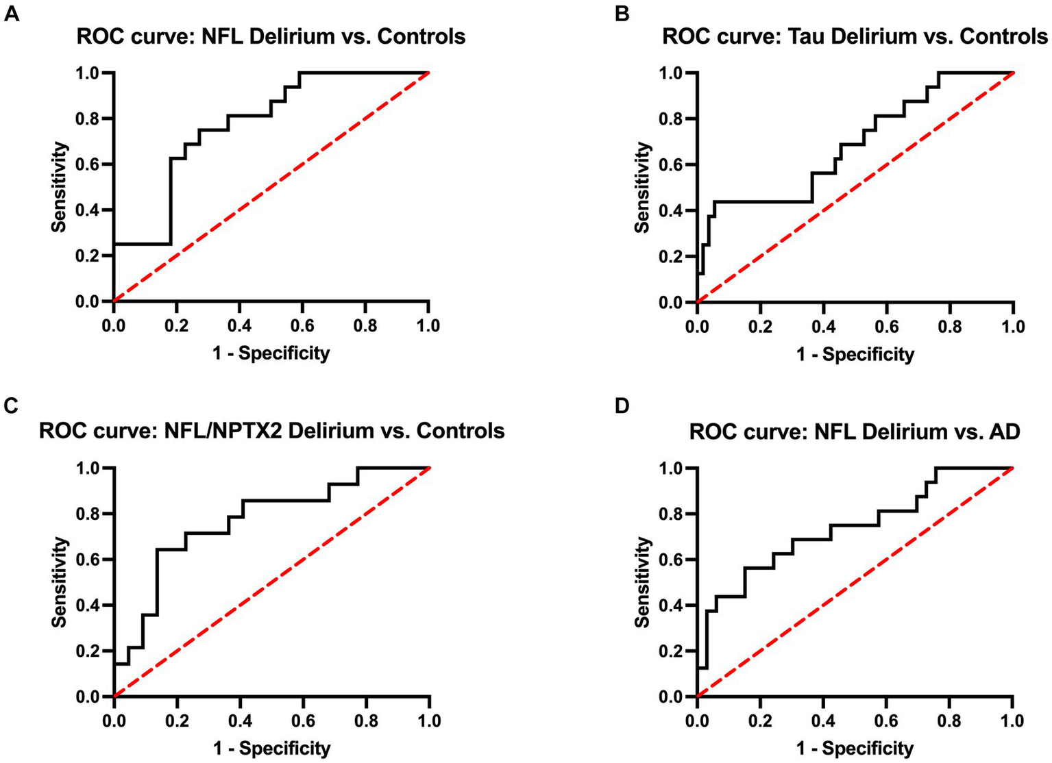 ROC curves of serum NFL (A), serum tau (B), and the ratio of NFL and CSF NPTX2 (C) to discriminate delirium from non-AD controls and ROC curve of serum NFL to discriminate delirium from AD (D). The AUC values for distinguishing delirium from non-AD controls are 0.78 (95% CI 0.63–0.92) for NFL, 0.74 (95% CI 0.58–0.90) for tau, and 0.77 (95% CI 0.61–0.93) for NFL/NPTX2. The AUC for distinguishing delirium from AD is 0.74 (95% CI 0.58–0.89).