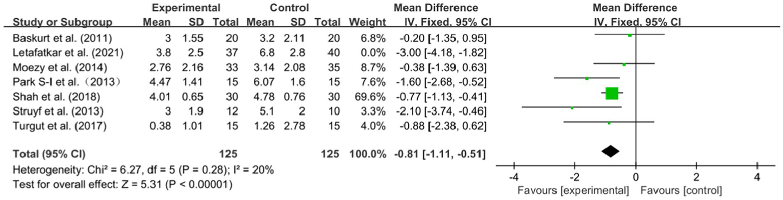 The VAS scores of 327 patients were obtained in seven RCTs. After merging the data, the heterogeneity was obvious (I2 = 68%, p = 0.005). Based on a meta-analysis using a random-effect model, the VAS scores in the experimental group were significantly better than those in the control group [WMD = −0.81, 95% CI (−1.11, −0.51), p < 0.001] (Figure 4). To determine the reasons for the high heterogeneity, sensitivity analysis revealed a significant reduction in heterogeneity (I2 = 20%, p = 0.28) after deleting the study by Letafatkar et al. (53), while the deletion of any other research did not significantly affect the heterogeneity. Using fixed-effect model analysis, the results showed that the combined effect quantities were more stable [WMD = −0.94, 95% CI (−1.23, −0.65), p < 0.001] (Figure 5).
