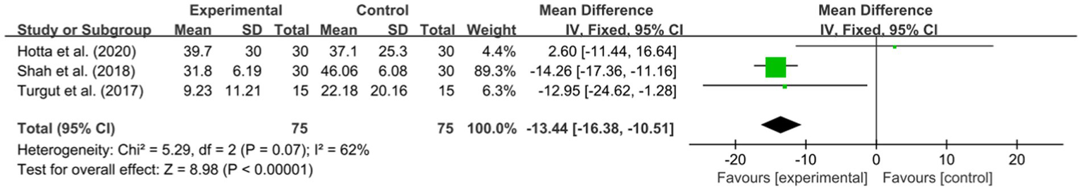 SPADI scores were obtained in three RCTs involving a total of 150 participants. According to the heterogeneity test, there were obvious statistically significant differences between the studies (I2 = 62%, p = 0.07), so we chose the random-effect model. There was a significant difference in SPADI scores between the experimental and control groups based on a meta-analysis [WMD = −10.10, 95% CI (−18.87, −1.33), p = 0.02] (Figure 6). Similarly, according to the sensitivity analysis, heterogeneity was caused by including the Hotta et al. (48) study, however, heterogeneity decreased significantly after the study was deleted (I2 = 0%, p = 0.83). The fixed-effect model analysis showed that the results were more stable [WMD = −14.17, 95% CI (−17.17, −11.17), p < 0.001] (Figure 7).