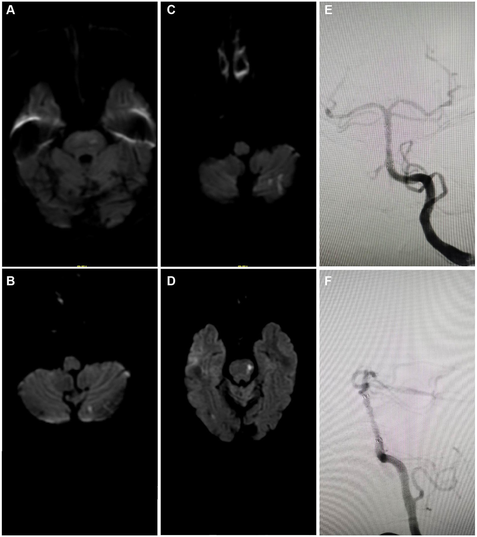 Imaging case analysis of cerebral infarction progression after rivaroxaban treatment. (A) New infarct foci in the left pons region 7 months post-treatment. (B) New infarct foci in the left cerebellar hemisphere 8 months post-treatment. (C) New infarct foci in the left cerebellar hemisphere 17 months post-treatment. (D) New infarct foci in the left pons region 24 months post-treatment. (E,F) 24-month post-treatment angiographic review following rivaroxaban treatment showed the ISR rate at the lower end of the basilar artery where the stent was implanted was approximately the same as preoperative, about 20%.
